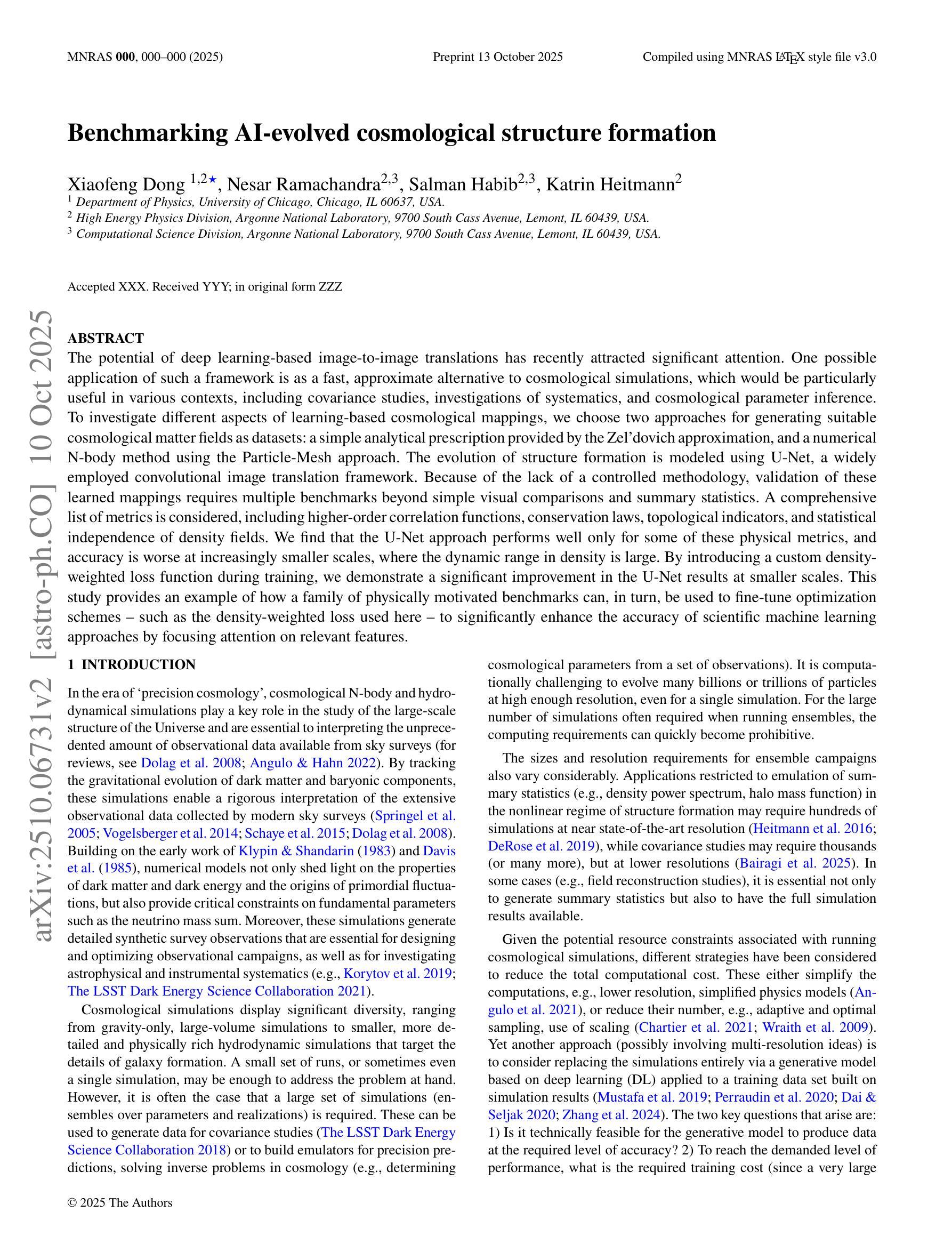 - 对学习映射的性能进行了全面的评估,包括高阶相关函数、守恒定律、拓扑指标和密度场的统计独立性等物理指标。