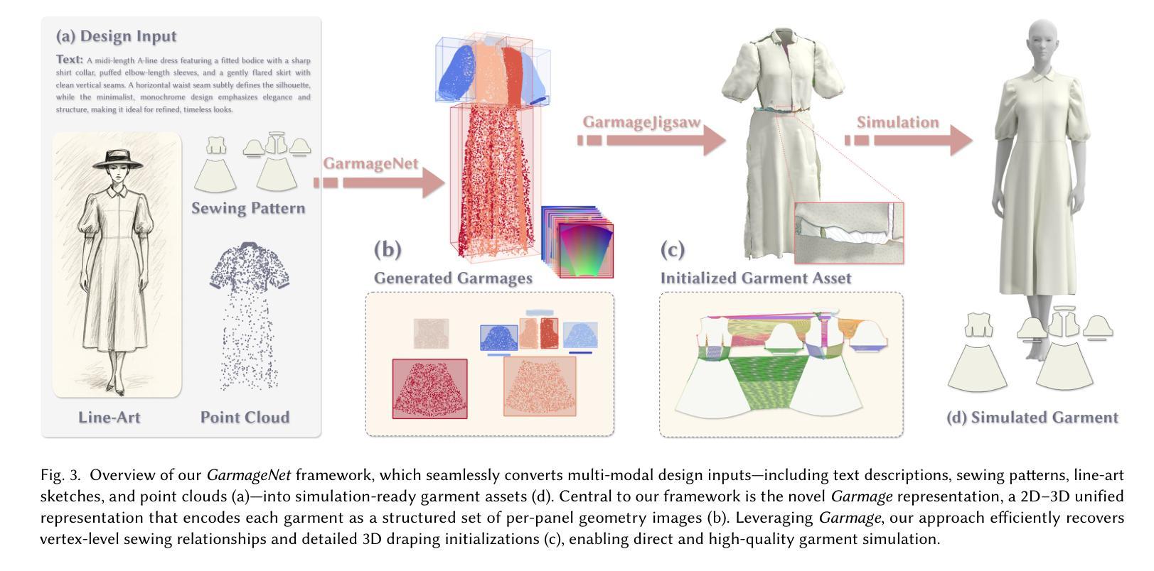 - GarmageNet是一个统一的生成框架,能够自动化创建二维缝纫图案、构建缝纫关系,并合成可用于物理模拟的三维服装初始化。