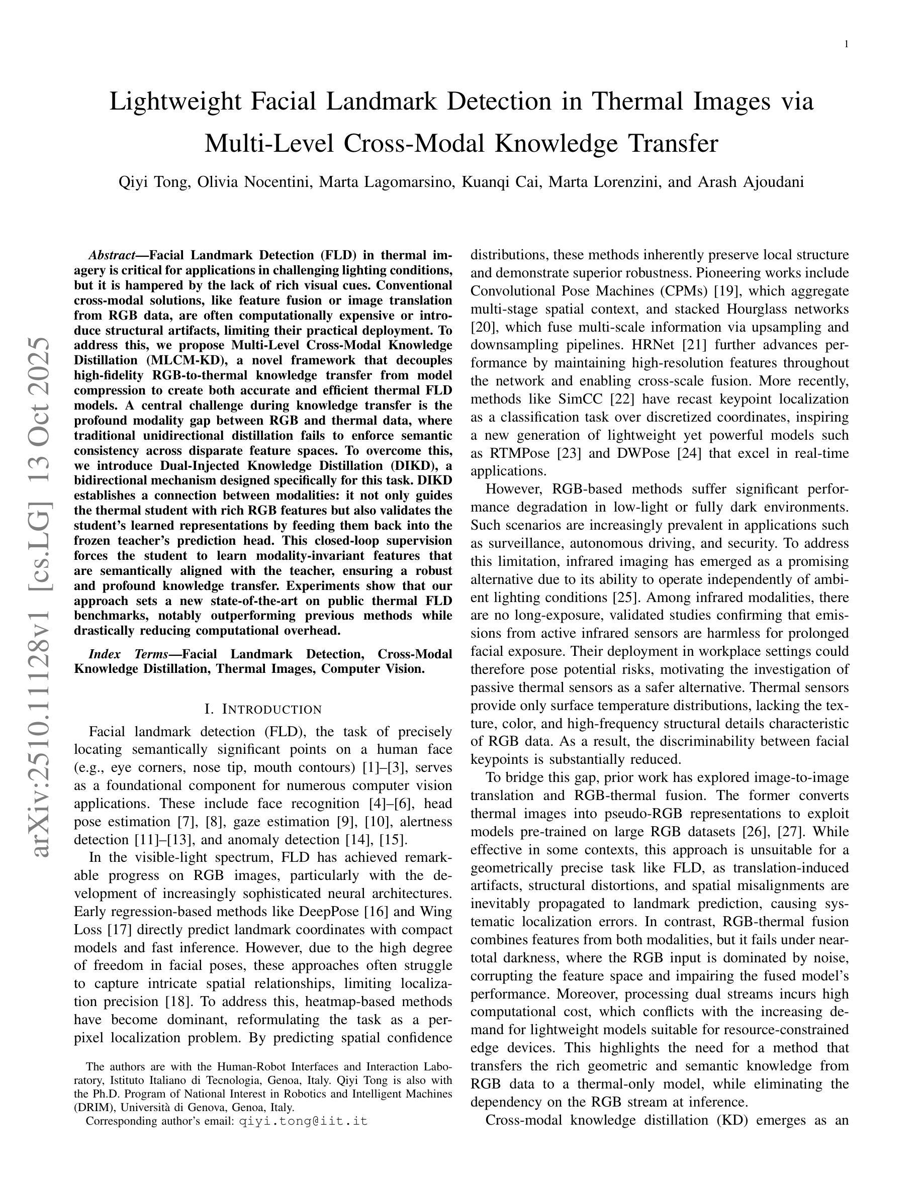 Facial Landmark Detection (FLD) in thermal imagery is critical for applications in challenging lighting conditions, but it is hampered by the lack of rich visual cues. Conventional cross-modal solutions, like feature fusion or image translation from RGB data, are often computationally expensive or introduce structural artifacts, limiting their practical deployment. To address this, we propose Multi-Level Cross-Modal Knowledge Distillation (MLCM-KD), a novel framework that decouples high-fidelity RGB-to-thermal knowledge transfer from model compression to create both accurate and efficient thermal FLD models. A central challenge during knowledge transfer is the profound modality gap between RGB and thermal data, where traditional unidirectional distillation fails to enforce semantic consistency across disparate feature spaces. To overcome this, we introduce Dual-Injected Knowledge Distillation (DIKD), a bidirectional mechanism designed specifically for this task. DIKD establishes a connection between modalities: it not only guides the thermal student with rich RGB features but also validates the student’s learned representations by feeding them back into the frozen teacher’s prediction head. This closed-loop supervision forces the student to learn modality-invariant features that are semantically aligned with the teacher, ensuring a robust and profound knowledge transfer. Experiments show that our approach sets a new state-of-the-art on public thermal FLD benchmarks, notably outperforming previous methods while drastically reducing computational overhead.