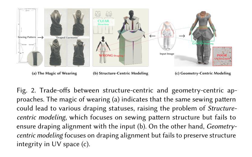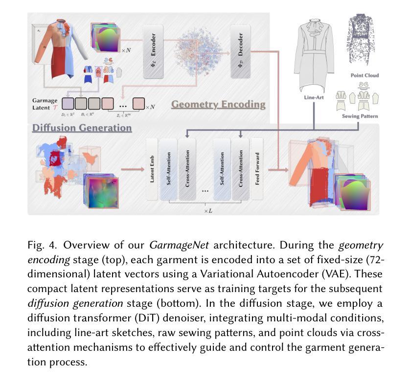 现实主义的数字服装建模仍然是一个劳动密集型的任务,这主要是由于将二维缝纫图案转化为高保真、可进行模拟的3D服装的复杂过程。我们引入了GarmageNet,这是一个统一的生成框架,可以自动创建2D缝纫图案、构建缝纫关系,并合成与基于物理的模拟兼容的3D服装初始化。我们的方法的核心是Garmage,这是一种新的服装表示方法,它将每个面板编码为结构化的几何图像,有效地弥合了二维结构图案和三维服装几何之间的语义和几何差距。其次是GarmageNet,一个用于合成面板级几何图像的潜在扩散变压器,以及GarmageJigsaw,一个用于预测面板轮廓沿线点对点缝纫连接的神经网络模块。为了支持和评估我们的方法,我们构建了GarmageSet,这是一个包含14801个专业设计的服装的大规模数据集,具有详细的结构和风格注释。我们的方法展示了在多个应用场景下的通用性和有效性,包括从多模式设计概念(文本提示、草图、照片)进行可扩展的服装生成、从原始平面缝纫图案的自动建模、从非结构化的点云中的模式恢复,以及使用常规指令进行渐进式的服装编辑,为数字时尚的完全自动化、生产准备管道奠定了基础。项目页面:https://style3d.github.io/garmagenet/。