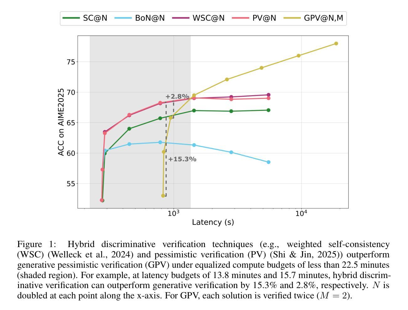 大规模语言模型在复杂推理任务中的测试时间缩放策略可有效提升性能。尽管目前最先进的方法通常采用生成式验证器从候选池中筛选最佳解决方案,但这种方法计算成本高昂,限制了其实际应用。本研究转向更注重预算的判别式验证方法。虽然孤立地看,判别式验证器性能可能不如生成式验证器,但当与自我一致性相结合时,在测试时间缩放机制中展现出强大的效率和效果。在固定计算预算下,这种混合方法显著超越了最先进的生成式验证方法,在AIME2025上提高了高达15.3%的准确率。本研究发现,对于实际应用,预算意识的判别式验证不仅是自我一致性的“免费”升级,而且是成本高昂的生成技术的更高效替代方案。