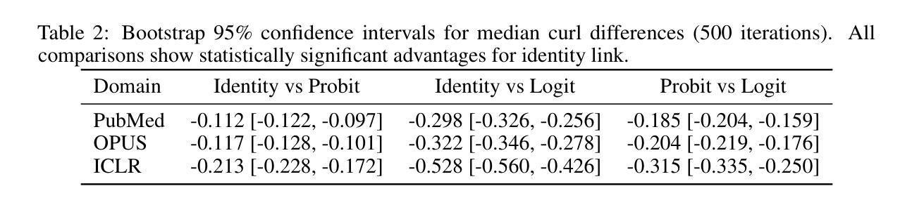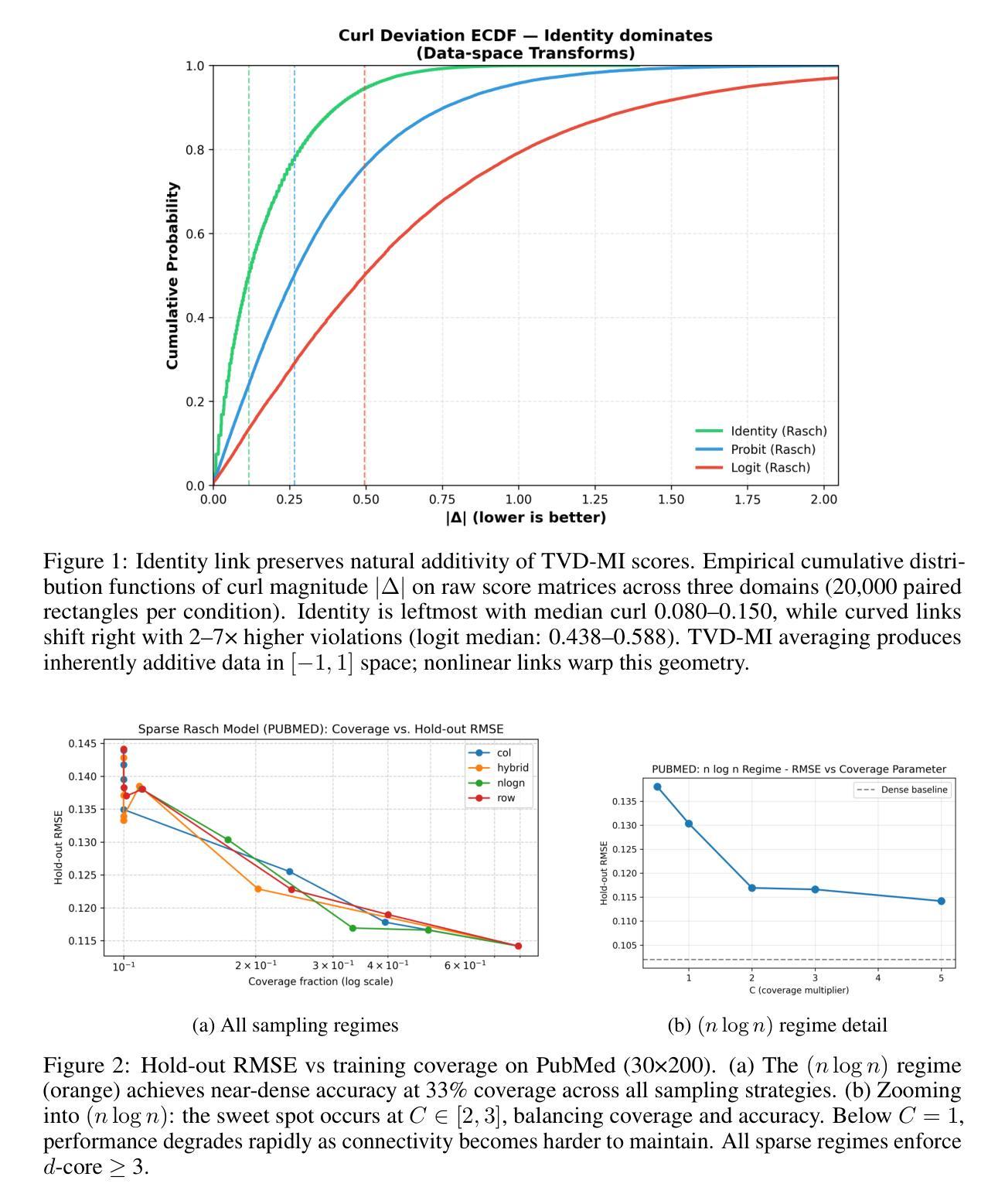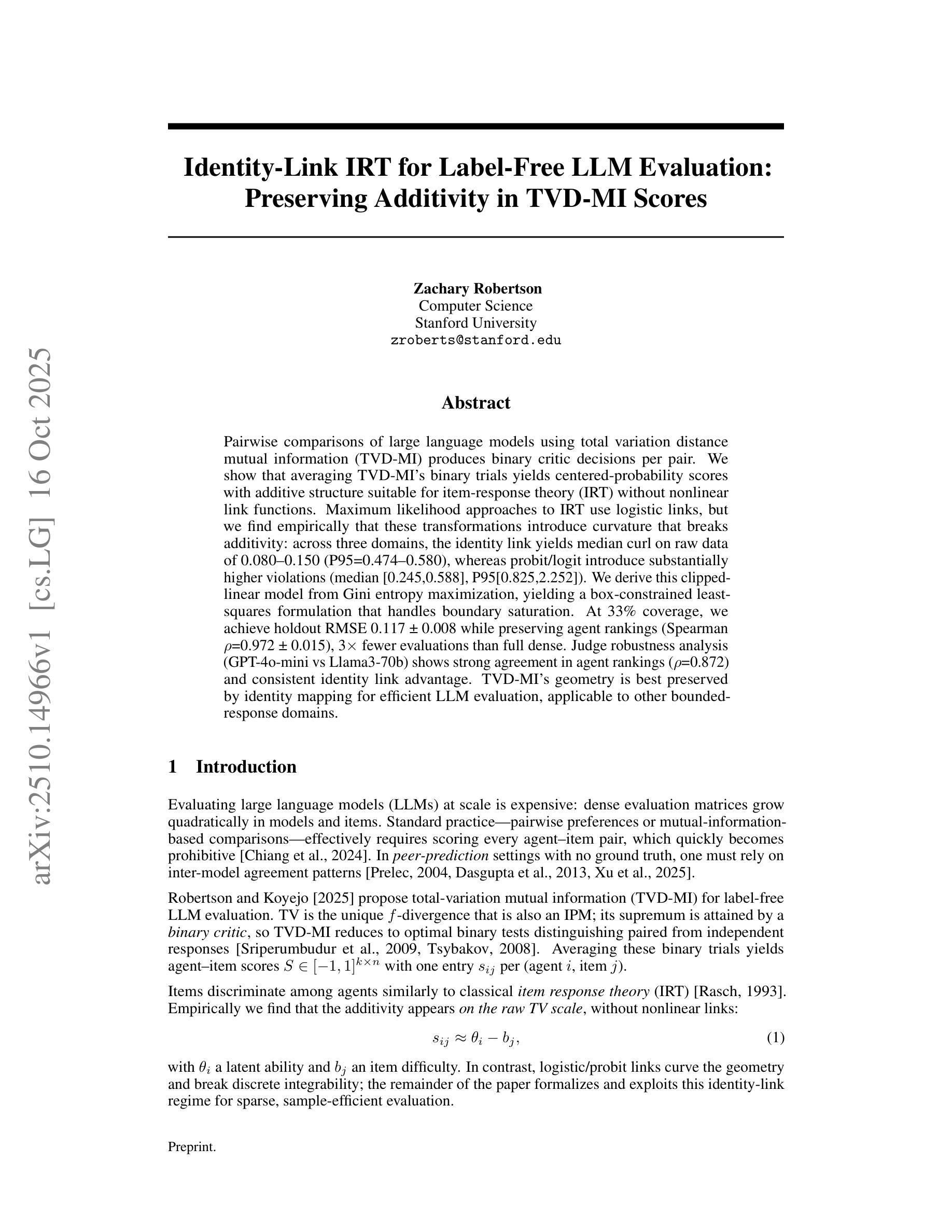 使用总变差距离互信息(TVD-MI)进行大型语言模型的配对比较,产生每对的二元批评决策。我们展示平均TVD-MI的二元试验会产生适合项目反应理论(IRT)的中心概率分数,具有可加结构而无需非线性链接函数。最大似然方法采用逻辑链接,但经验显示这些转换破坏了可加性引入了曲线。跨三个领域,身份链接导致原始数据的平均卷曲在0.080-0.150之间(P95 = [0.474,0.580]),而probit/logit引入的违规情况更高(中位数[0.245,0.588],P95 [0.825,2.252])。我们从基尼熵最大化中推导出这种被截断的线性模型,它采用框约束最小二乘法公式处理边界饱和问题。在覆盖率达到33%的情况下,我们实现了保留代理排名的同时的holdout RMSE为$ 0.117 \pm 0.008 $(Spearman $\rho = 0.972 \pm 0.015$),所需评估次数减少到全密集情况下的三分之一。法官稳健性分析(GPT-4o-mini与Llama3-70b的比较)显示代理排名高度一致(ρ= 0.872),进一步证实了身份链接的优势。对于大型语言模型评估,身份映射可以更好地保留TVD-MI的几何结构,适用于其他有界响应领域。