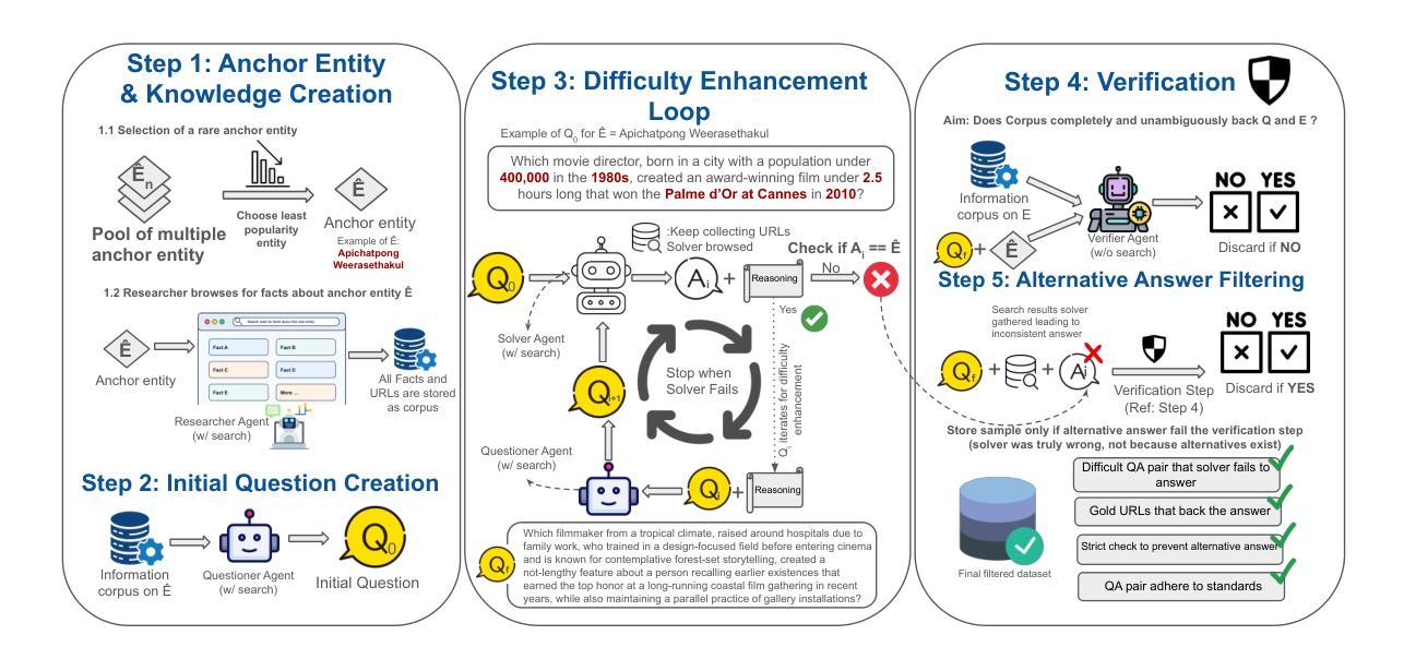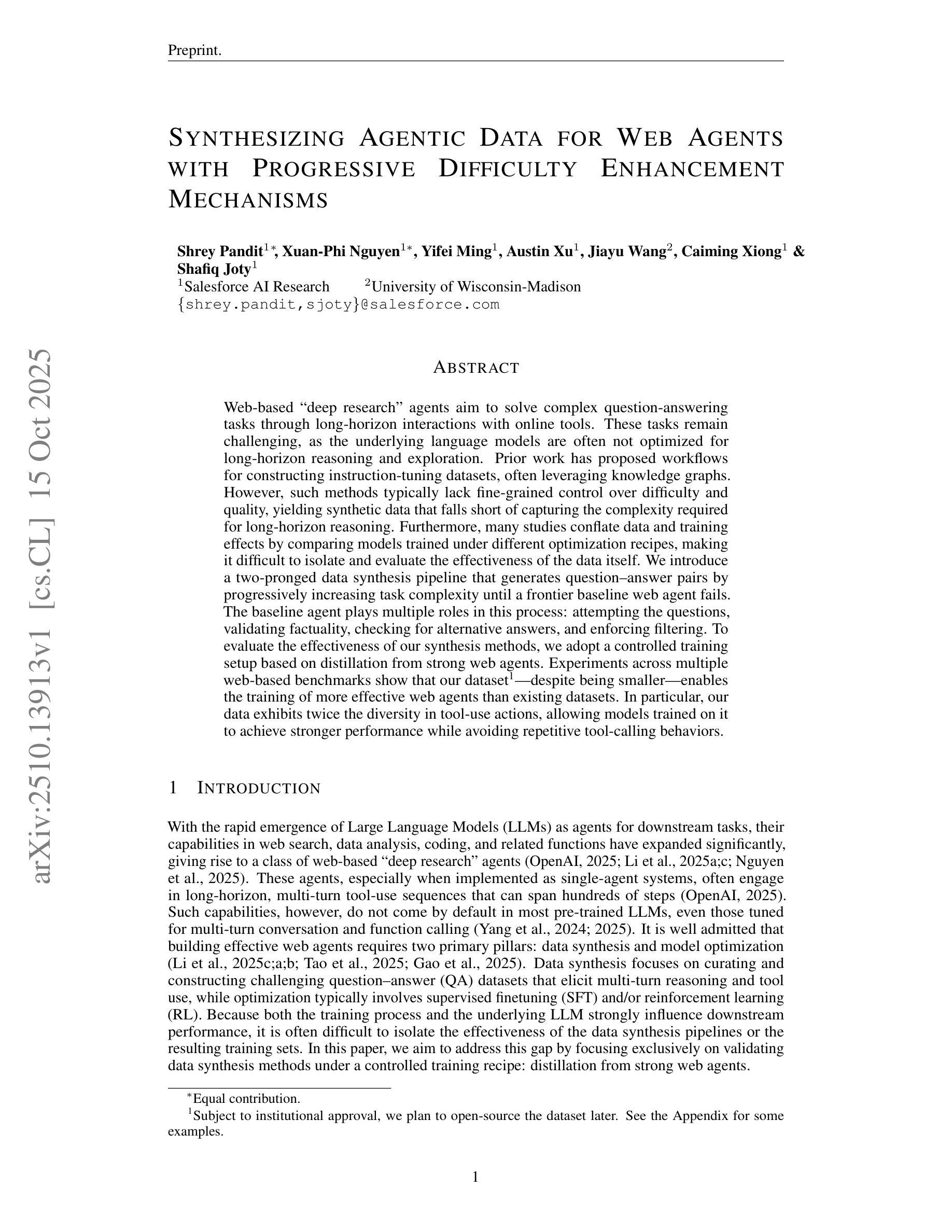 基于网络的”深度研究”代理旨在通过与在线工具进行长期互动来解决复杂的问答任务。这些任务仍然具有挑战性,因为基础语言模型通常没有经过长期推理和探索的优化。早期的工作已经提出了构建指令调整数据集的工作流程,通常利用知识图谱。然而,这些方法通常缺乏对难度和质量的精细控制,产生的合成数据无法捕捉长期推理所需的复杂性。此外,许多研究通过比较在不同优化配方下训练的模型来混淆数据和训练效果,很难孤立地评估数据本身的有效性。我们引入了一种双管齐下的数据合成管道,通过逐步增加任务复杂性来生成问答对,直到前沿基线网络代理失败。基线代理在这个过程中扮演了多个角色:尝试问题、验证事实、检查替代答案和执行过滤。为了评估我们的合成方法的有效性,我们采用了基于从强大网络代理中提炼出来的受控训练设置。在多个网络基准测试上的实验表明,尽管我们的数据集较小,但它能够训练出比现有数据集更有效的网络代理。特别是,我们的数据在工具使用行为方面表现出两倍的多样性,使得在此数据上训练的模型能够取得更强的性能,同时避免重复的工具调用行为。