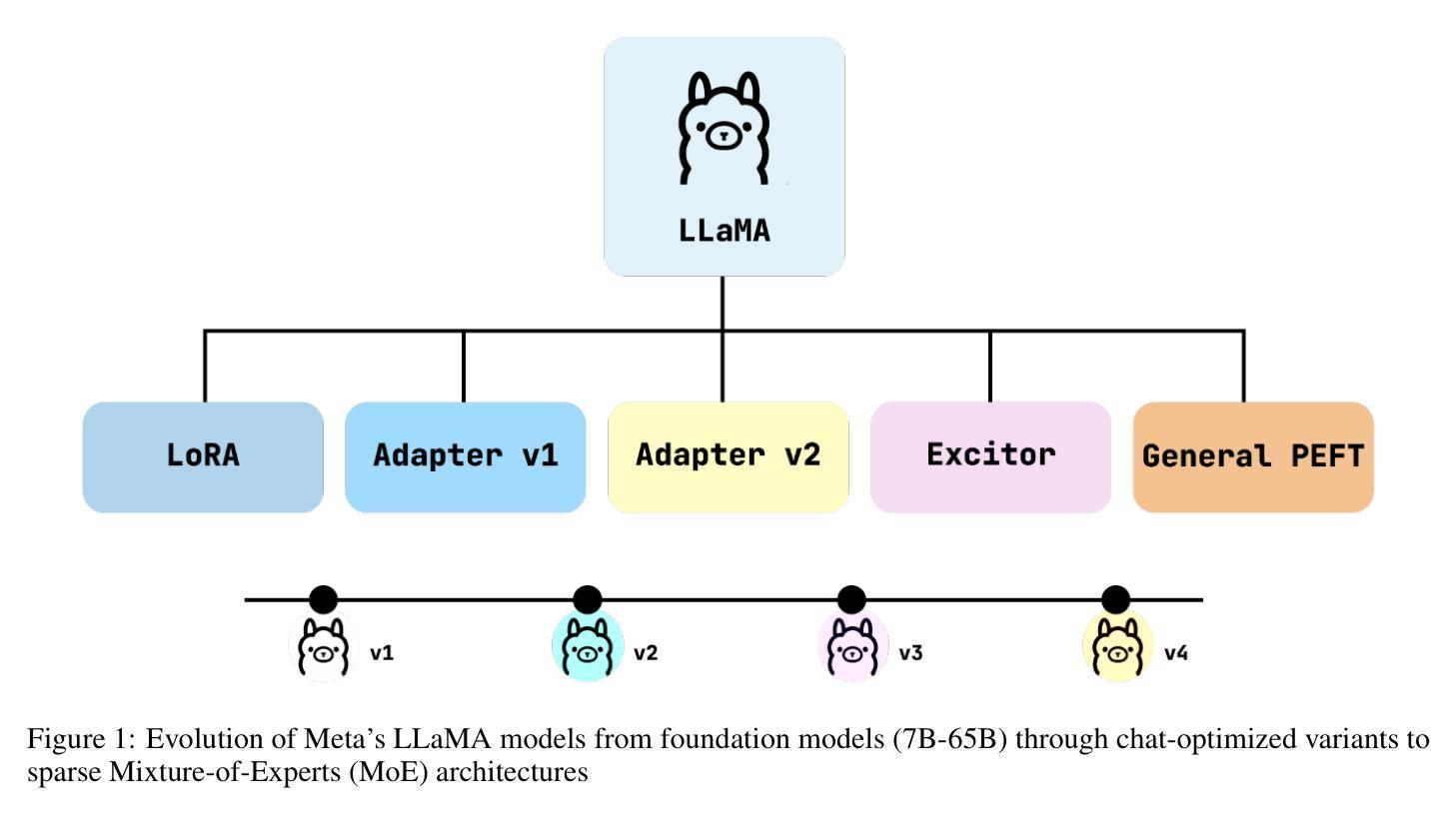 - LLaMA系列模型从LLaMA 1到LLaMA 4呈现快速进化,同时发展出参数高效微调(PEFT)方法。