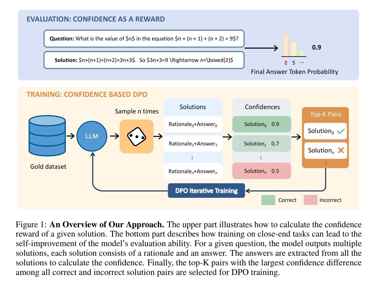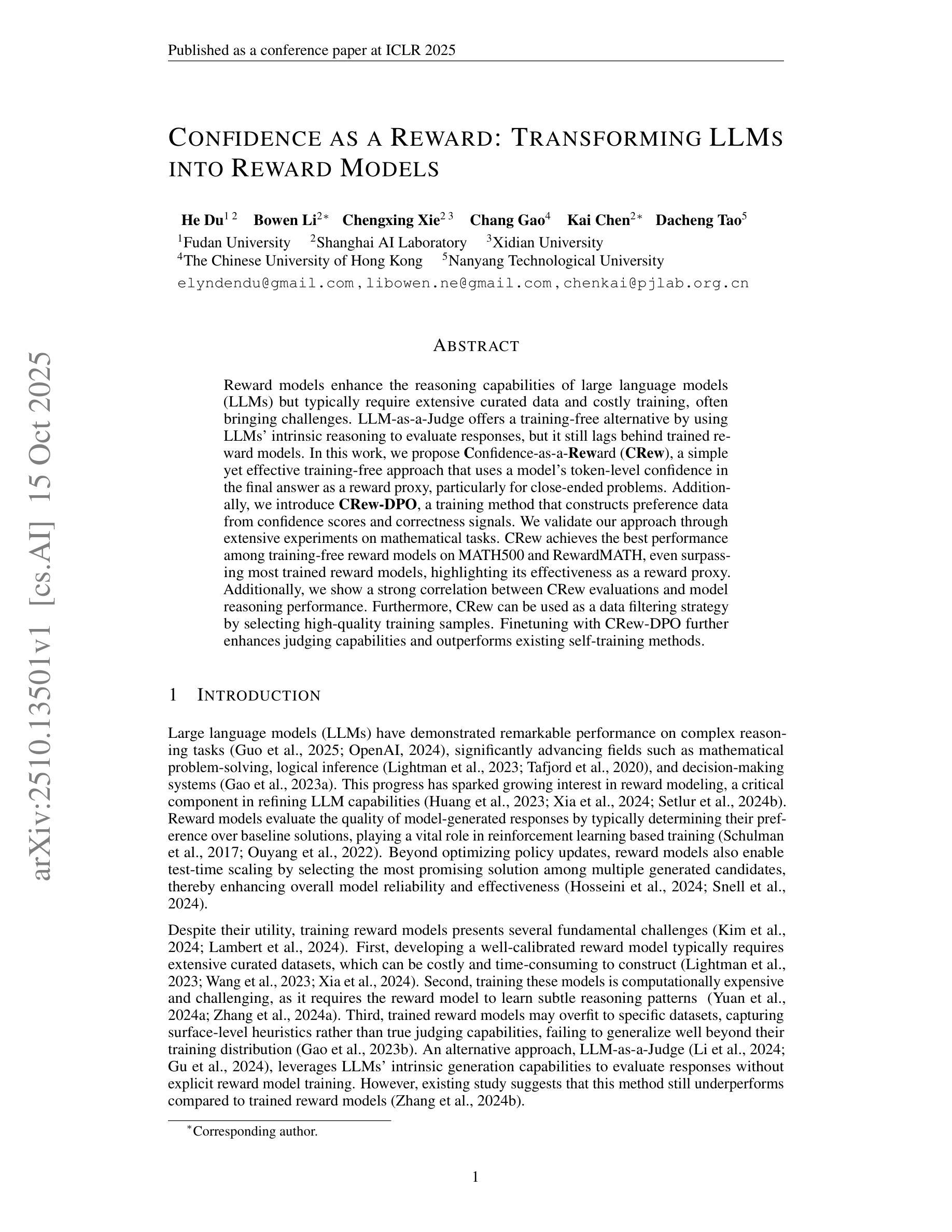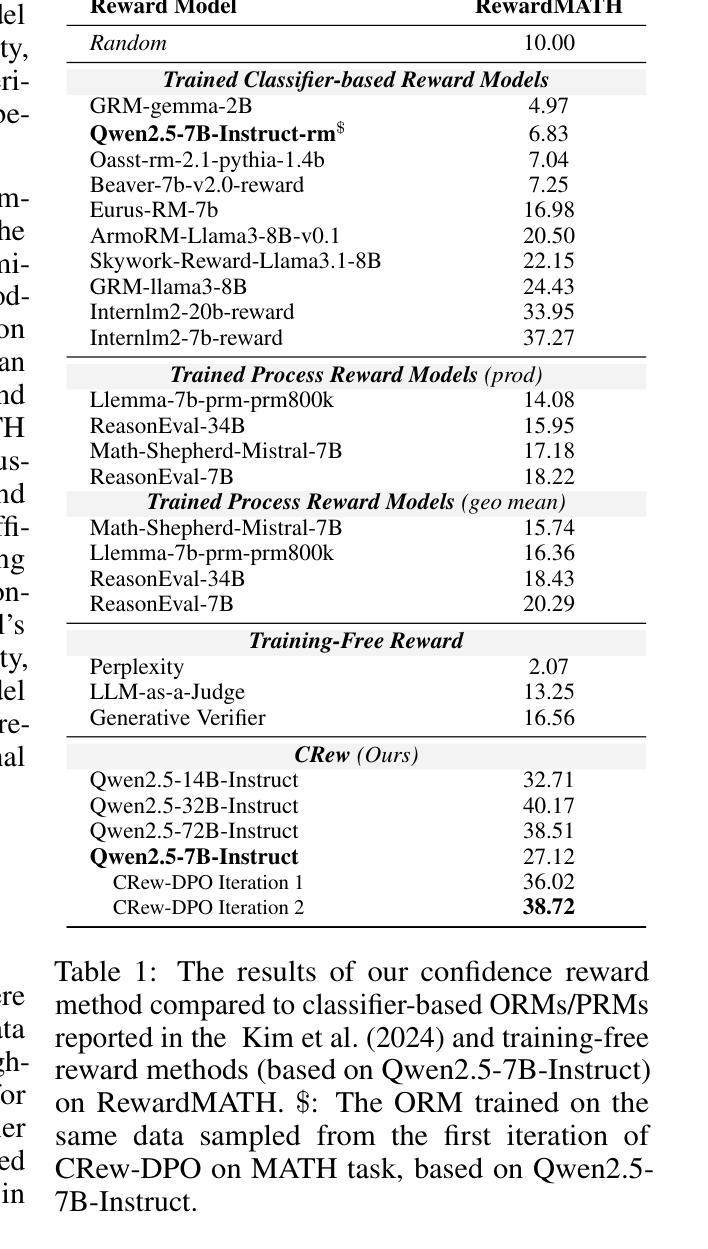 奖励模型能够显著提高大语言模型(LLM)的推理能力,但它们通常需要大量精心策划的数据和昂贵的训练成本。为了缓解这些挑战,无需训练的方法,如LLM-as-a-Judge,利用LLM的内在推理能力来评估响应,并取得了令人鼓舞的结果。最近的研究还表明,模型信心可以作为奖励指标,有效区分链式思维(CoT)和非CoT路径。然而,使用信心作为奖励的概念尚未得到全面研究。在这项工作中,我们系统地研究了信心作为奖励(CRew),这是一种简单而强大的无需训练的方法,利用模型最终答案的令牌级信心作为奖励的代理,尤其适用于封闭任务。通过在数学推理任务上的大量实验,我们证明了CRew在MATH500和RewardMATH基准测试上优于现有的无需训练的奖励方法,甚至超越了大多数经过训练的奖励模型。我们进一步发现CRew分数与模型的实际推理性能之间存在强烈的相关性。此外,我们发现CRew可以有效地过滤高质量的训练数据。基于这些见解,我们提出了CRew-DPO,这是一种结合信心分数和正确性信号构建偏好数据的训练策略。使用CRew-DPO进行微调进一步增强了模型的判断能力,并始终优于现有的自训练方法。