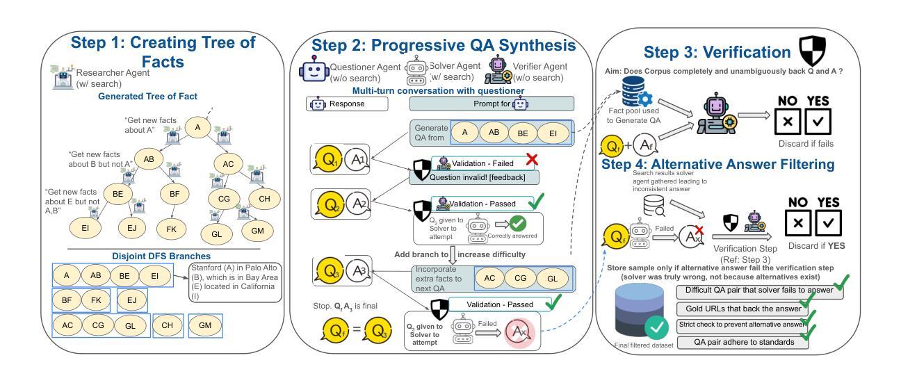 本研究介绍了一种两阶段数据合成流程,旨在生成针对基于Web的深度问答任务的数据集。该研究通过逐步提高任务复杂度来生成问答对,直至基线Web代理无法完成任务。基线代理在此过程中扮演多重角色,包括尝试问题、验证事实性、检查替代答案和执行过滤。实验表明,尽管数据量较小,但本研究的数据集能够有效训练Web代理,使其表现优于现有数据集。其数据集在工具使用动作方面表现出两倍的多样性,可训练模型表现出更强性能并避免重复性工具调用行为。