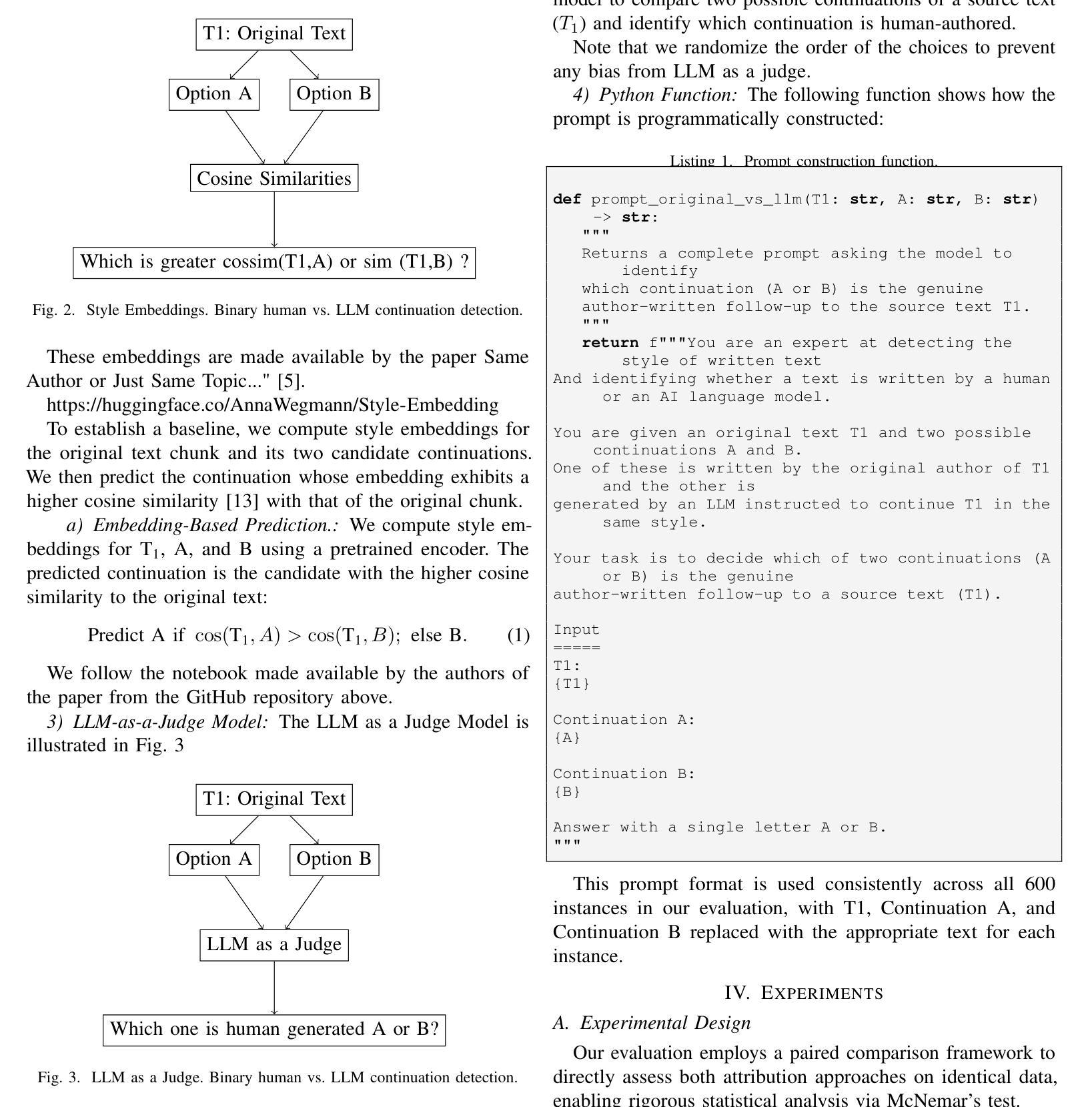 - 风格嵌入和LLM判断器是两种互补的归属机制,在Human AI Parallel Corpus数据集上进行评估。