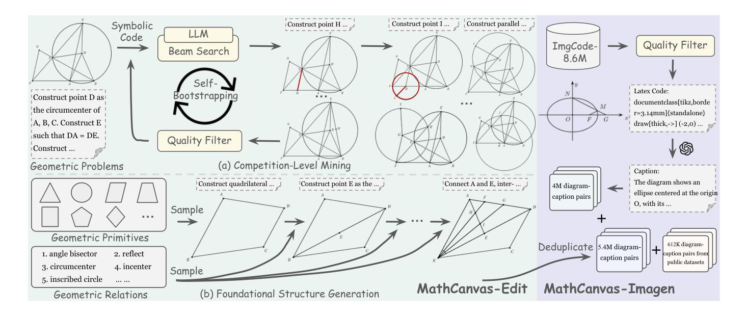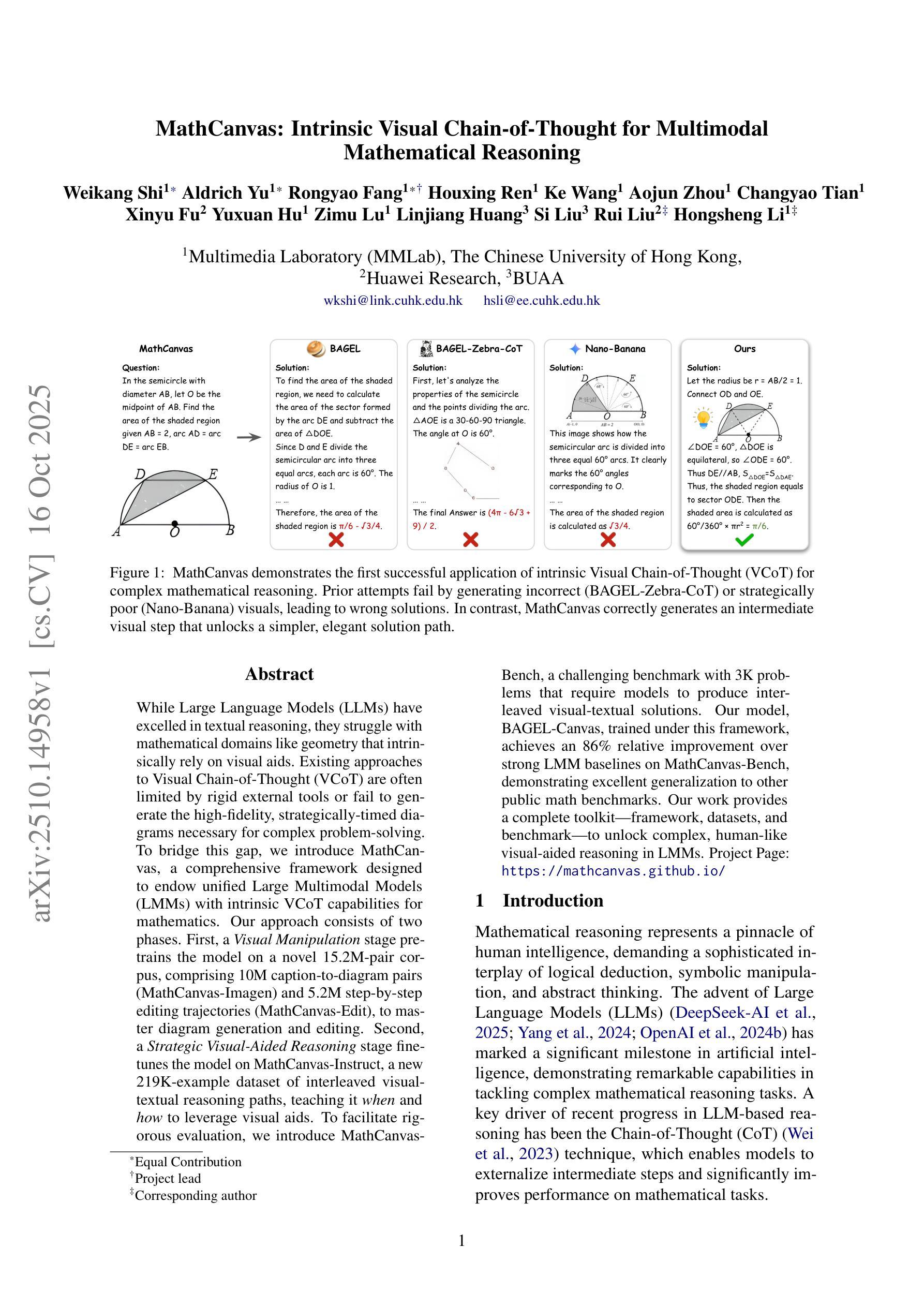大型语言模型(LLM)在文本推理方面表现出色,但在依赖视觉辅助工具的几何等数学领域却遇到困难。现有的视觉思维链(VCoT)方法往往受到僵化外部工具的限制,或者无法生成用于复杂问题解决的具有高保真度、战略定时图的必要。为了弥补这一差距,我们引入了MathCanvas,这是一个旨在赋予统一的大型多模态模型(LMM)内在VCoT能力的全面框架,用于数学领域。我们的方法分为两个阶段。首先,视觉操作阶段使用新型1520万对数据对模型进行预训练,其中包括1亿个标题到图表的配对(MathCanvas-Imagen)和520万步的编辑轨迹(MathCanvas-Edit),以掌握图表生成和编辑。其次,战略视觉辅助推理阶段在MathCanvas-Instruct数据集上进行微调,这是一组包含交错视觉文本推理路径的新数据集,含有21.9万个示例,教学模型何时以及如何利用视觉辅助工具。为了促进严格评估,我们推出了MathCanvas-Bench,这是一个具有挑战性的基准测试,包含3000个问题,需要模型生成交错的视觉文本解决方案。在我们的框架训练下的BAGEL-Canvas模型在MathCanvas-Bench上的表现相较于强大的LMM基准测试有了86%的相对改进,展现出对其他公共数学基准测试的出色泛化能力。我们的工作提供了一个完整的工具包框架、数据集和基准测试,以解锁LMM中复杂、类似人类的视觉辅助推理。项目页面:https://mathcanvas.github.io/