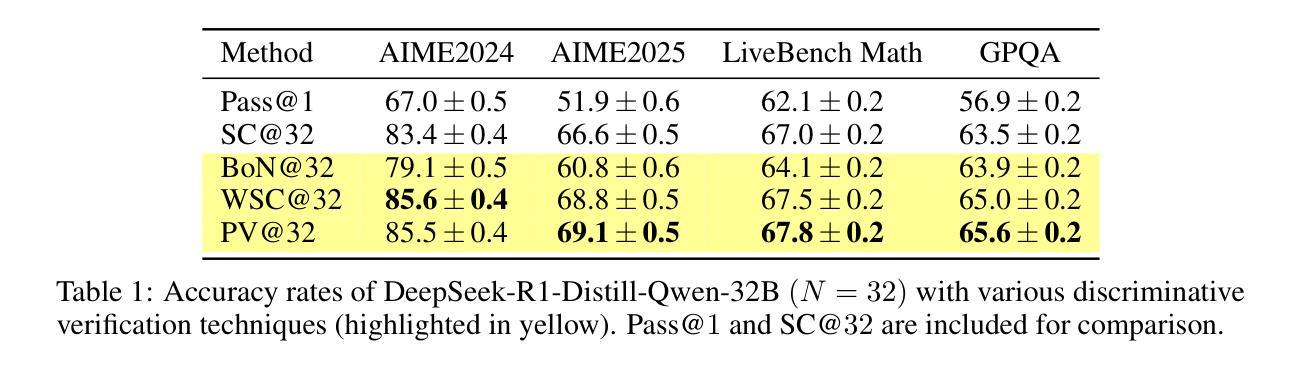- 判别式验证器与自我一致性相结合的混合方法在测试时间缩放中展现出强大的效率和效果。
