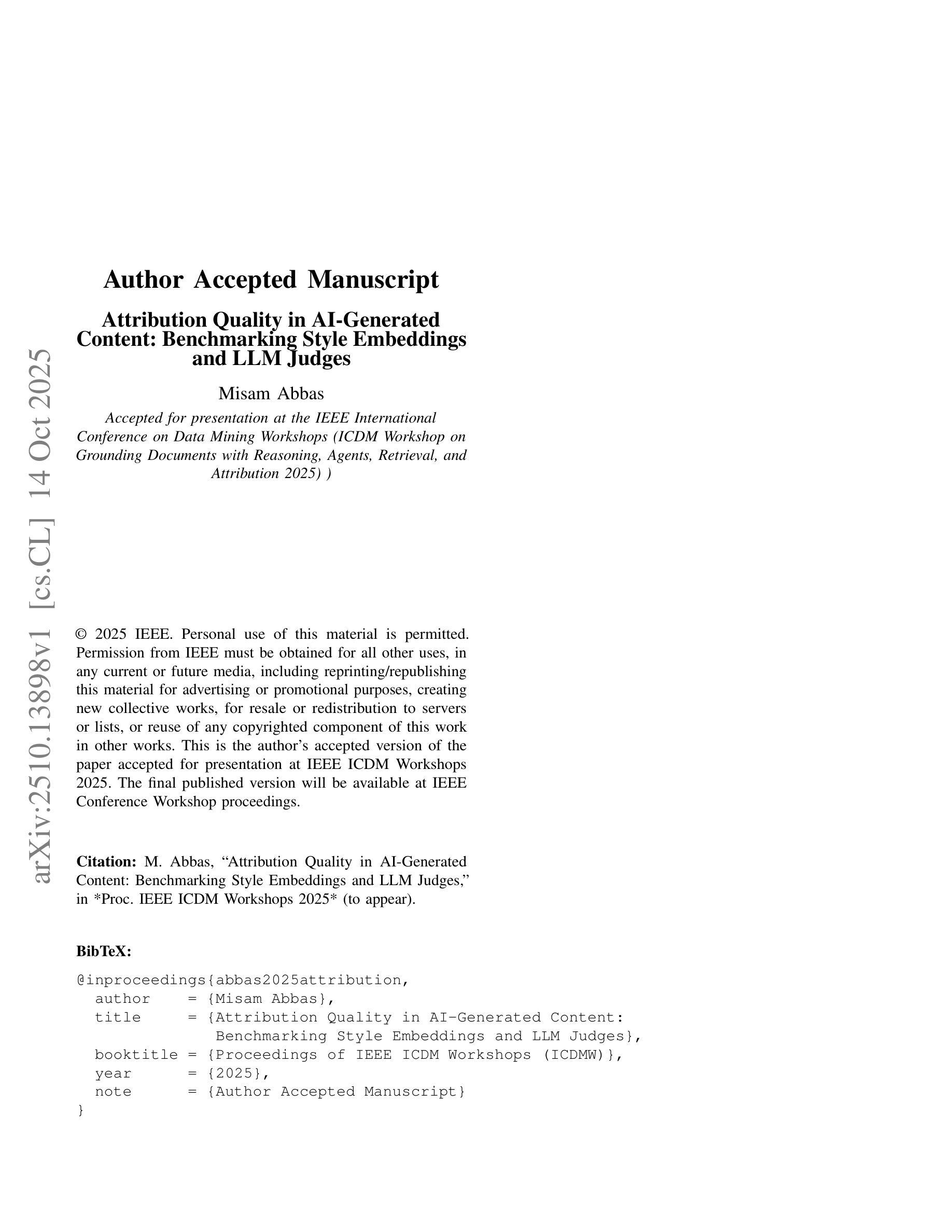 在大型语言模型(LLM)时代,对作者归属的认定越来越具有挑战性,因为机器生成的散文与人类的写作能力不相上下。我们在Human AI Parallel Corpus上基准测试了两种互补的归属机制,即固定的风格嵌入和一个经过指令训练的LLM判断器(GPT-4o)。这是一个包含600个平衡实例的开放数据集,涵盖六个领域(学术、新闻、小说、博客、口语转录和电视/电影剧本)。每个实例都包含一个人类提示,其中包括黄金延续和来自GPT-4o或LLaMA-70B-Instruct的LLM生成延续。风格嵌入基线在GPT延续上达到了更高的总体准确率(82%对68%)。LLM判断器在LLaMA延续上略胜于风格嵌入(85%对81%),但结果不具有统计学意义。关键的是,LLM判断器在小说和学术散文方面的表现显著优于其他方法,显示出语义敏感性,而嵌入法则主导口语和剧本对话,反映了其结构性优势。这些互补模式强调了归属是一个多维问题,需要混合策略来解决。为了支持可重复性,我们在GitHub上提供了代码,并在Hugging Face上提供了衍生数据,遵循MIT许可证。这一开放框架为AI生成内容的归属质量评估提供了可重复性的基准测试,并对影响这项工作的相关文献进行了评述。