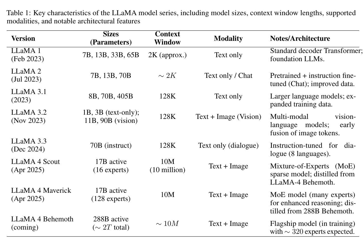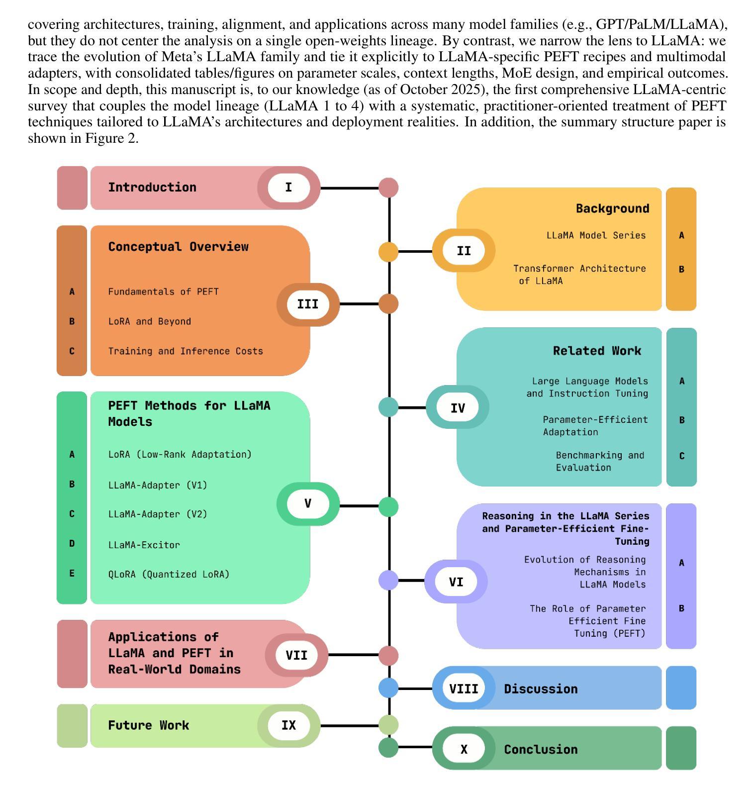 本文回顾了Meta AI的LLaMA(大型语言模型Meta AI)系列的快速发展,从LLaMA 1到LLaMA 4以及为这些模型开发的专用参数高效微调(PEFT)方法。首先,我们描述了LLaMA基础模型家族(从7B到65B再到288B参数)、它们的架构(包括原生多模态和混合专家变体)和关键性能特征。然后,我们介绍并讨论了PEFT的概念,该概念通过仅更新一小部分参数来适应大型预训练模型,并回顾了五种已应用于LLaMA的PEFT方法:LoRA(低秩适应)、LLaMA-Adapter V1和V2、LLaMA-Excitor和Quantized LoRA(QLoRA)。我们讨论了每种方法的机制、参数节省情况以及其在LLaMA上的示例应用(例如指令调整、多模态任务)。我们对模型和适配器架构、参数计数和基准测试结果进行了结构化讨论和分析(包括微调后的LLaMA模型表现超过较大基准模型的示例)。最后,我们研究了LLaMA模型及其在现实世界中成功应用的PEFT的实际用例(例如法律和医学领域),并讨论了当前面临的挑战和未来研究方向(如扩展到更大的上下文环境和提高稳健性)。这篇综述论文为对LLaMA模型和高效微调策略感兴趣的机器学习研究人员和从业者提供了一个一站式的资源。