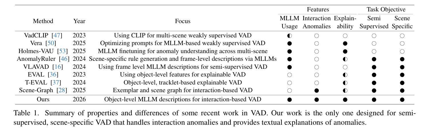 - 现有半监督视频异常检测方法在检测涉及对象交互的复杂异常时存在局限性,缺乏可解释性。