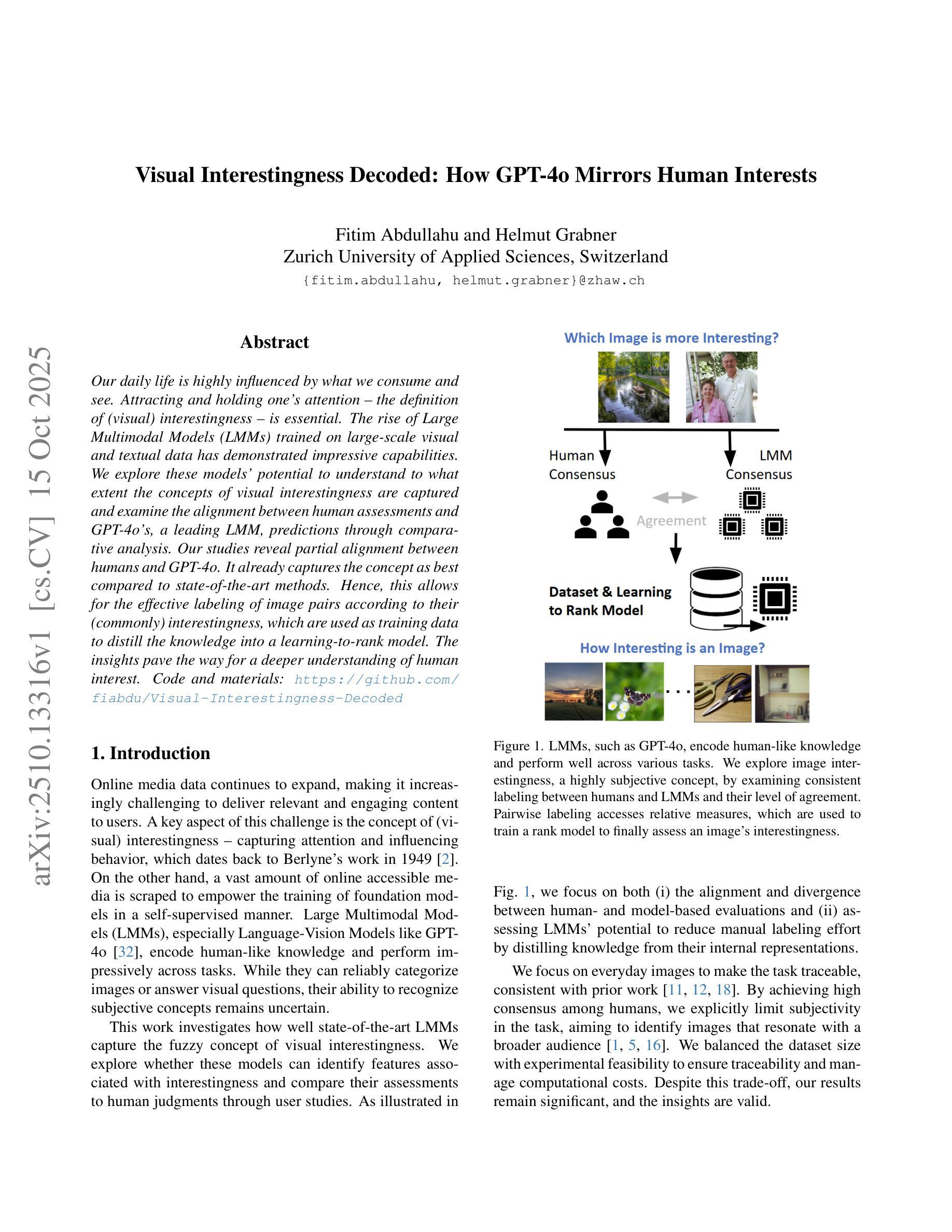 我们的日常生活受到我们所消费和所看到内容的高度影响。吸引并维持人们的注意力——(视觉)有趣性的定义——至关重要。经过大规模视觉和文本数据训练的大型多模态模型(LMMs)的崛起展现了令人印象深刻的能力。我们探索了这些模型在理解视觉有趣性概念方面的潜力,并通过对比分析,检验了人类对GPT-4o(一款领先的大型多模态模型)预测的评价的一致性。我们的研究表明,人类与GPT-4o之间存在部分一致性。与其他最先进的方法相比,它已经捕捉到了最佳的概念。因此,这可以更有效地根据它们的(普遍)有趣性对图像对进行标注,这些标注作为训练数据被提炼成一种学习排名模型。这些见解为人类兴趣的更深入理解铺平了道路。