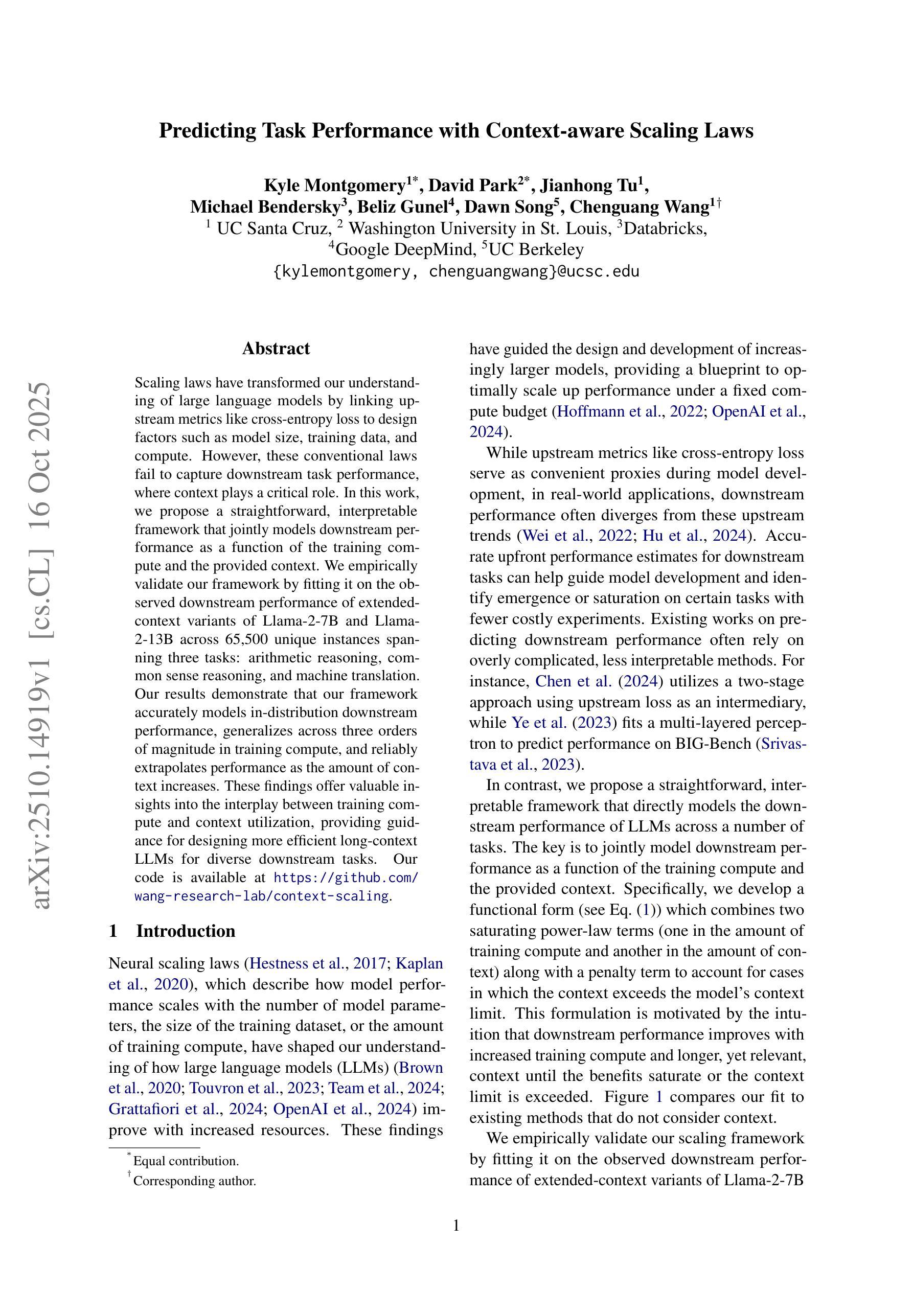 - 研究提出了一个联合建模下游性能的简单且可解释的框架,该框架考虑了训练计算量和上下文的影响。