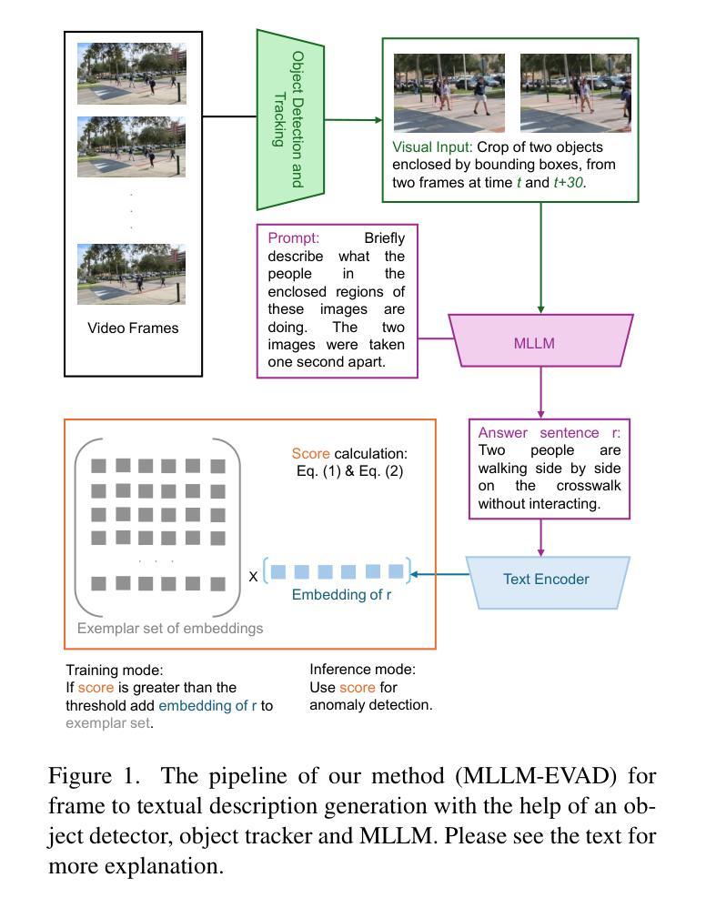 现有的半监督视频异常检测(VAD)方法在检测涉及对象交互的复杂异常时经常遇到困难,并且通常缺乏可解释性。为了克服这些局限性,我们提出了一种利用多模态大语言模型(MLLMs)的新型VAD框架。与以前基于MLLM的方法直接在帧级别进行异常判断不同,我们的方法侧重于提取和解释对象活动和随时间变化的交互。我们通过使用MLLM查询不同时刻的对象对的视觉输入,从标准视频中生成活动和交互的文本描述。这些文本描述作为视频中对象活动和交互的高级表示。它们在测试时通过比较标准训练视频中的文本描述来检测异常。我们的方法本质上提供了可解释性,并且可以与传统VAD方法结合使用,以进一步增强其可解释性。在基准数据集上的大量实验表明,我们的方法不仅有效地检测基于交互的异常,而且在没有交互异常的数据集上也达到了最先进的性能。