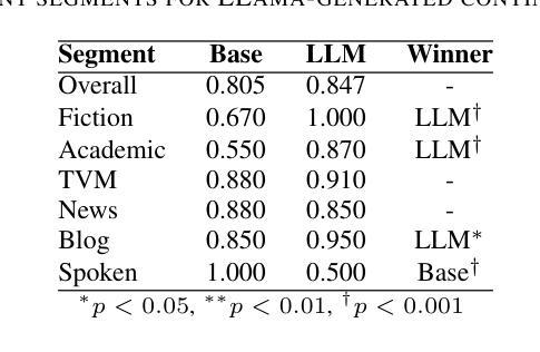 - 风格嵌入在GPT续作中的总体准确率更高,达到82%,而LLM判断器在LLaMA续作上的准确率略高,但结果不具有统计学意义。