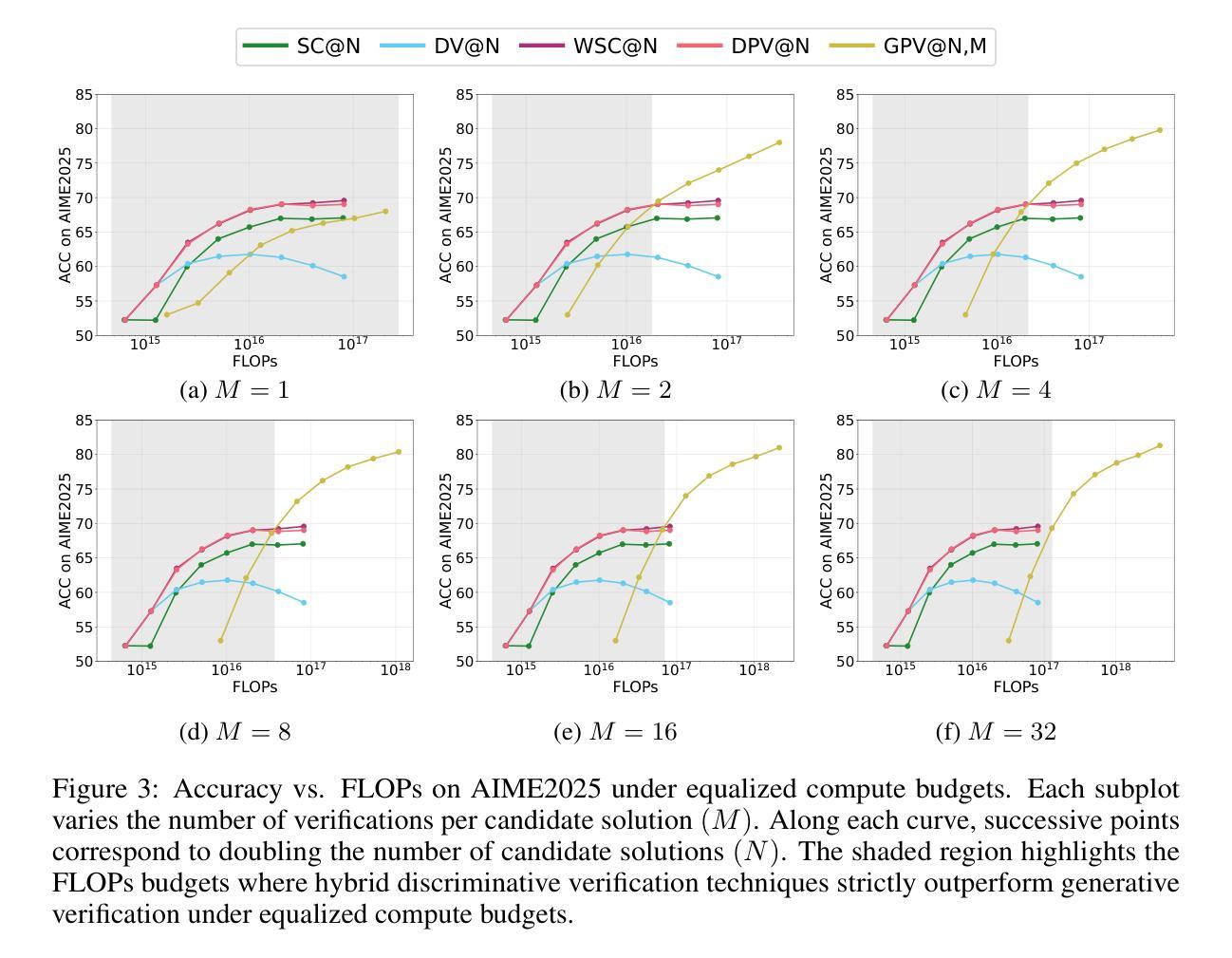 - 在固定计算预算下,混合方法显著超越了生成式验证方法,提高了AIME2025上的准确率。