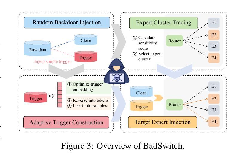 - BadSwitch优化了触发嵌入的预训练过程,同时识别并约束最敏感专家进行路由选择。