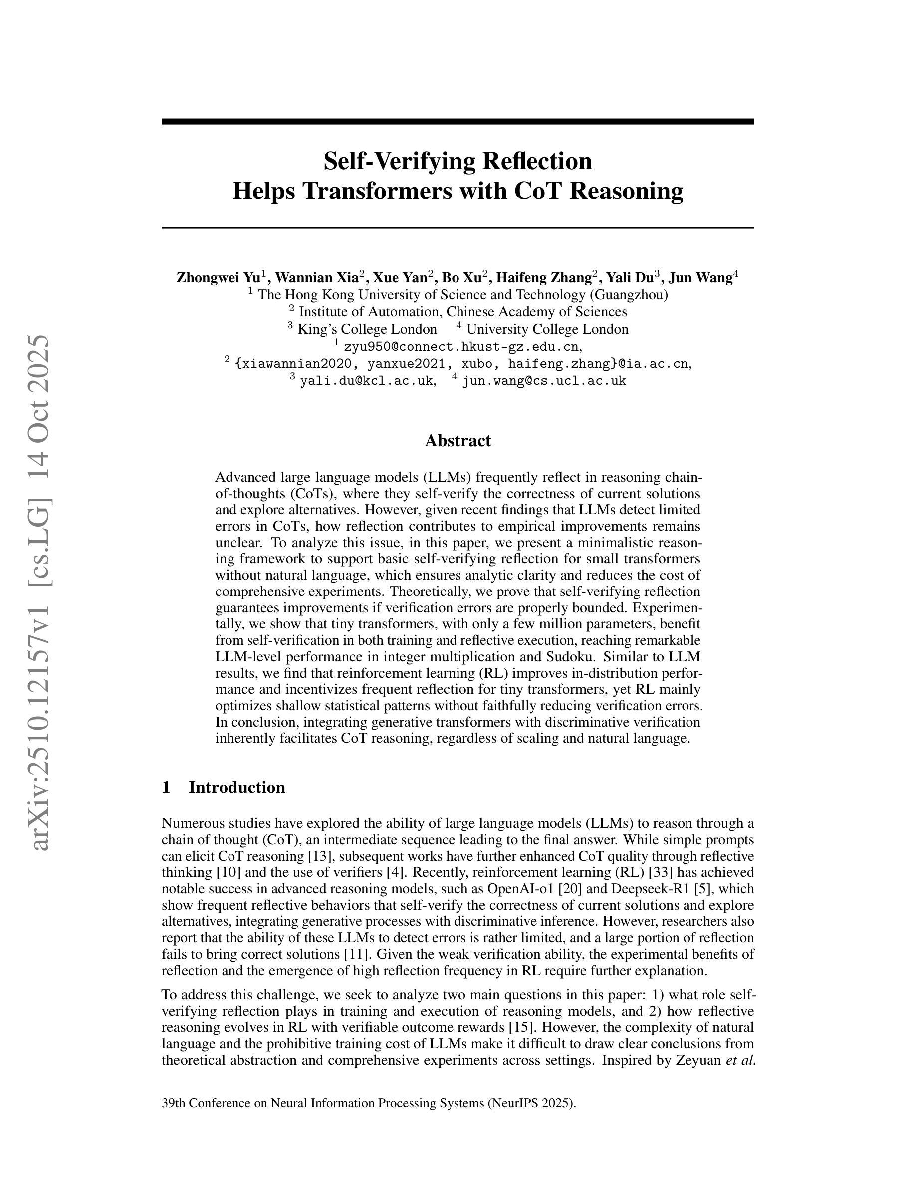 高级大语言模型(LLM)在推理过程中会进行自我验证和探索替代方案。然而,鉴于最近发现LLM在推理过程中检测到的错误有限,反思如何对经验改进做出贡献尚不清楚。本文提出一个简约的推理框架,支持小变形器的基本自我验证反思,无需自然语言,确保分析清晰并降低全面实验的成本。理论上,我们证明了如果验证错误得到适当控制,自我验证反思可以保证改进。实验表明,只有几百万参数的微型变形器在训练和反思执行中都受益于自我验证,在整数乘法和数独方面达到了惊人的LLM级性能。与LLM结果类似,我们发现强化学习(RL)提高了内部性能并激励了微型变形器的频繁反思,但RL主要优化浅统计模式,并没有真正减少验证错误。结论是,将生成式变形器与判别式验证相结合,有助于促进无论规模大小和自然语言的推理思考。