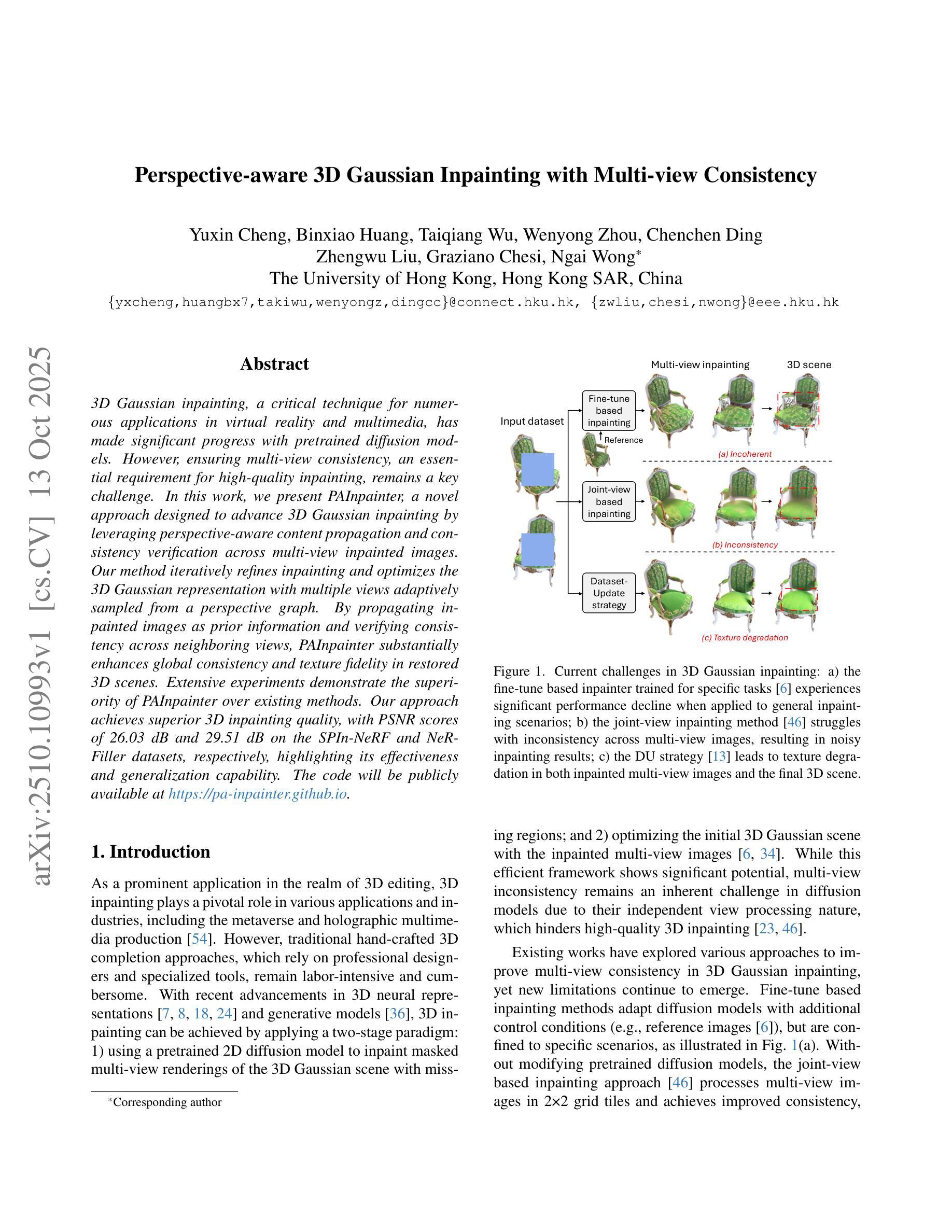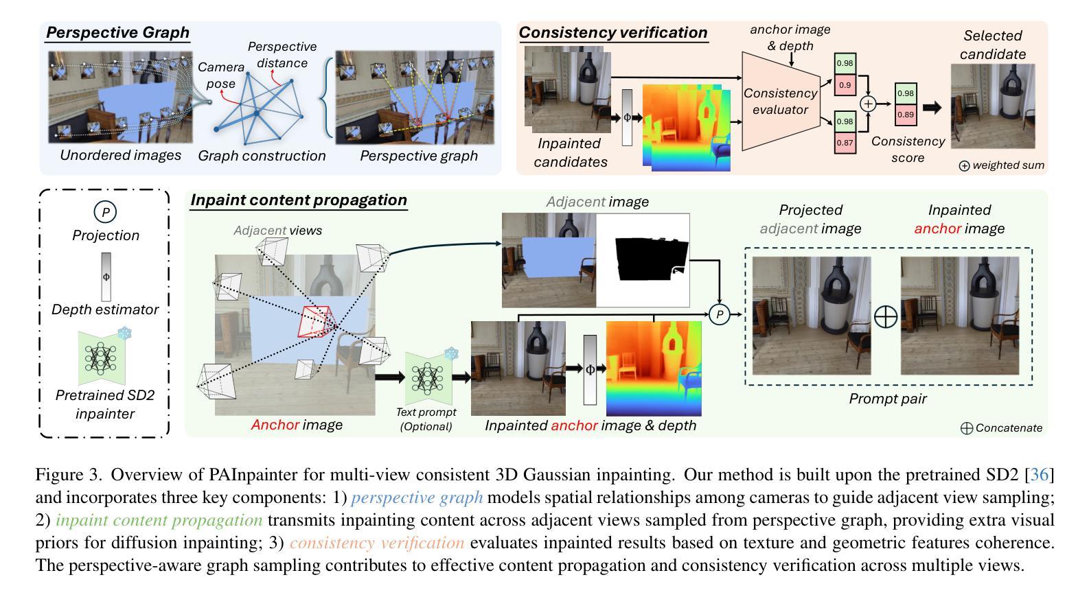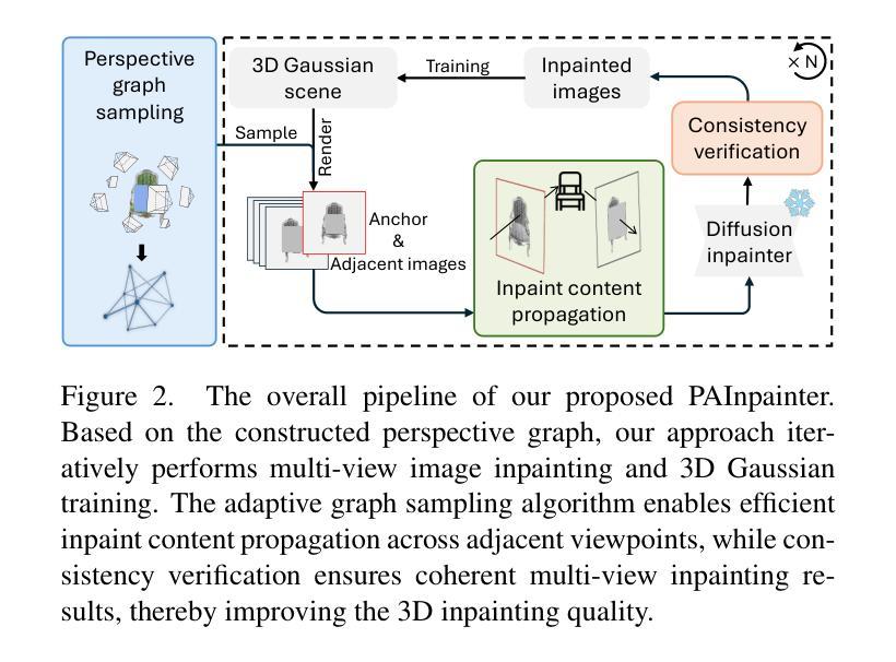 3D高斯补全技术对于虚拟现实和多媒体的众多应用至关重要,并且随着预训练的扩散模型取得了重大进展。然而,确保多视角一致性对于高质量补全至关重要,仍是关键挑战。在这项工作中,我们提出了PAInpainter,这是一种旨在通过利用透视感知内容传播和跨多视角补全图像的一致性验证来推动3D高斯补全技术发展的新方法。我们的方法通过迭代优化补全和自适应采样视角图的多个视角来优化3D高斯表示。通过将补全图像作为先验信息并验证相邻视角之间的一致性,PAInpainter极大地提高了恢复的三维场景中的全局一致性和纹理保真度。大量实验表明,PAInpainter相较于现有方法具有优越性。我们的方法在SPIn-NeRF和NeRFiller数据集上分别实现了PSNR分数为26.03 dB和29.51 dB的高质量三维补全效果,这凸显了其有效性和泛化能力。
