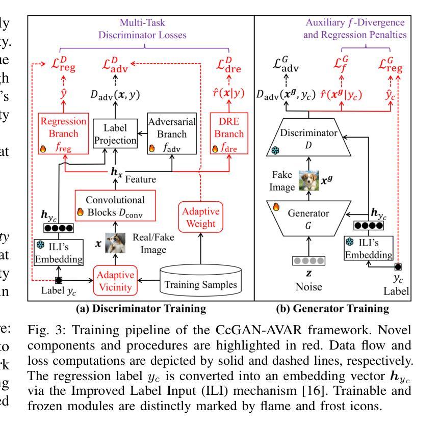 针对连续条件生成对抗网络(CcGAN)在数据分布估计中面临的数据不平衡和计算成本高昂的问题,提出了CcGAN-AVAR框架。该框架包含两个新组件以解决数据不平衡问题,并采用了GAN框架的原生一步生成器以实现高效采样。实验证明,CcGAN-AVAR在多个数据集上实现了出色的生成质量和采样效率。