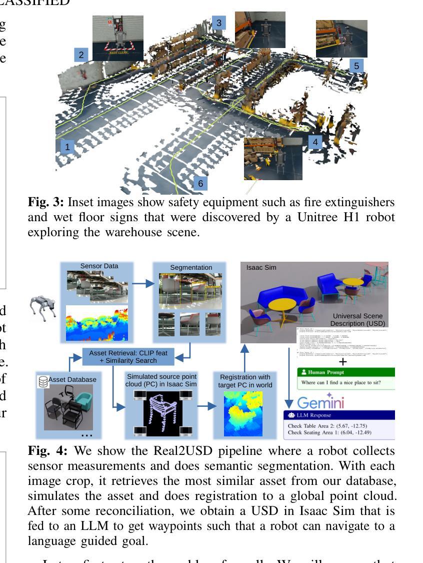 大型语言模型(LLM)可以帮助机器人对抽象任务规格进行推理。这要求增强机器人使用的经典环境表示法,并融入基于自然语言的前提知识。尽管有许多现有的方法可以做到这一点,但它们都是针对特定任务的,例如用于导航的视觉语言模型、用于地图绘制的语言引导神经辐射场等。本文认为,通用场景描述(USD)语言是一种针对基于LLM的机器人任务环境中几何、光度学和语义信息的有效且通用的表示方法。我们的观点很简单:USD是一种基于XML的场景图,LLM和人类都可以阅读,并且足够丰富以支持任何基本任务——皮克斯(Pixar)开发此语言是为了存储资产、场景甚至电影。我们展示了一个“现实到USD”系统,该系统使用Unitree Go2四足机器人携带激光雷达和RGB相机,该机器人(i)构建了具有各种对象和充满玻璃的挑战性设置的显式USD表示,以及(ii)使用Google的Gemini解析USD来展示场景理解、复杂推理和规划。我们还使用Nvidia的Issac Sim在模拟的仓库和医院环境中研究该系统的不同方面。代码可在https://github.com/grasp-lyrl/Real2USD找到。