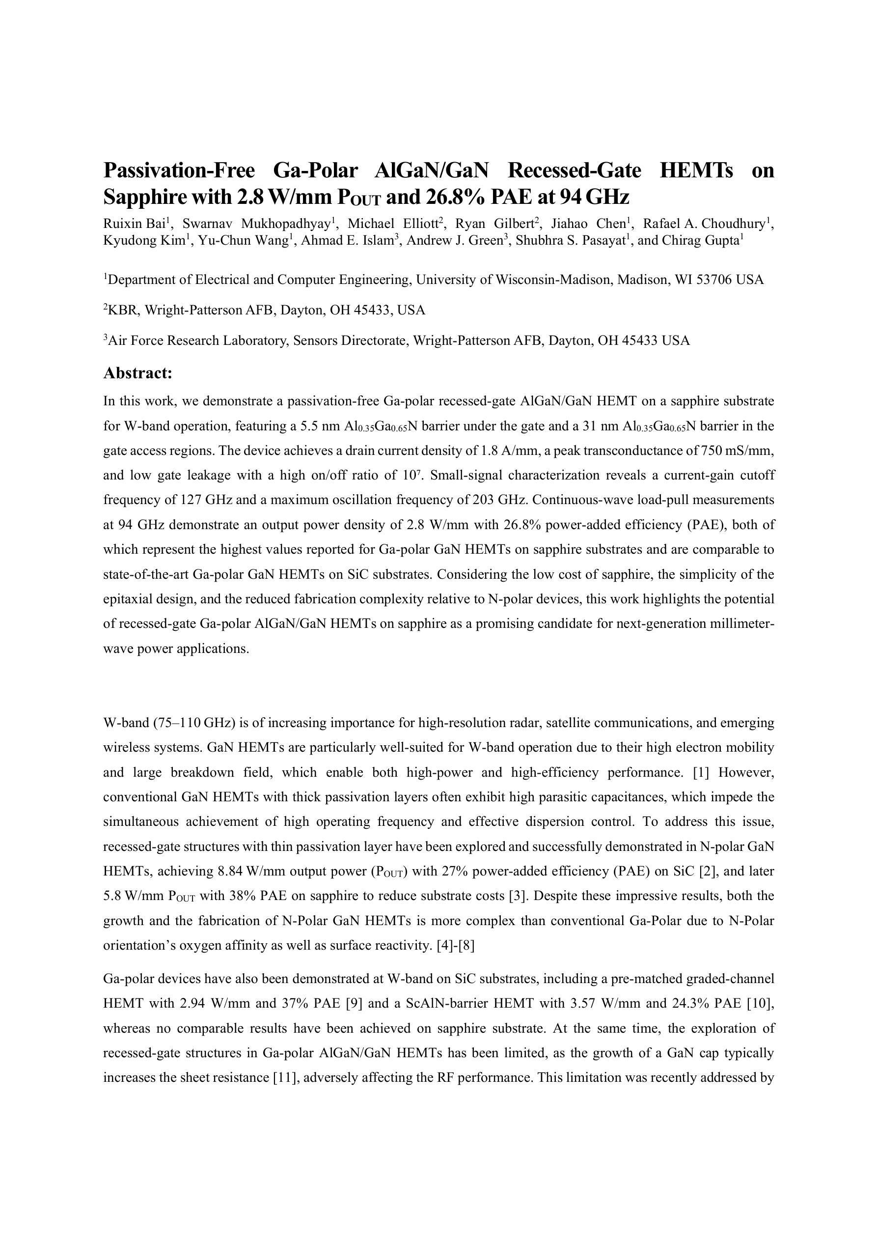 在这项工作中,我们在蓝宝石衬底上展示了无钝化的Ga极凹栅AlGaN/GaN高电子迁移率晶体管(HEMT),适用于W波段操作。其特点是门下含有5.5纳米Al0.35Ga0.65N势垒,以及栅极接入区域中的31纳米Al0.35Ga0.65N势垒。该器件实现了1.8 A/mm的漏电流密度、750 mS/mm的峰值跨导,以及高开/关比为10^7的低栅极泄漏。小信号表征显示电流增益截止频率为127 GHz,最大振荡频率为203 GHz。在94 GHz的连续波负载牵引测量中,输出功率密度为2.8 W/mm,功率附加效率(PAE)为26.8%,这两者均为蓝宝石衬底上Ga极GaN HEMT的最高值,并与SiC衬底上最先进的Ga极GaN HEMT相当。考虑到蓝宝石的低成本、外延设计的简单性,以及相对于N极器件的制造复杂性降低,这项工作突出了凹栅Ga极AlGaN/GaN HEMT在蓝宝石上的潜力,可作为下一代毫米波功率应用的有前途的候选者。