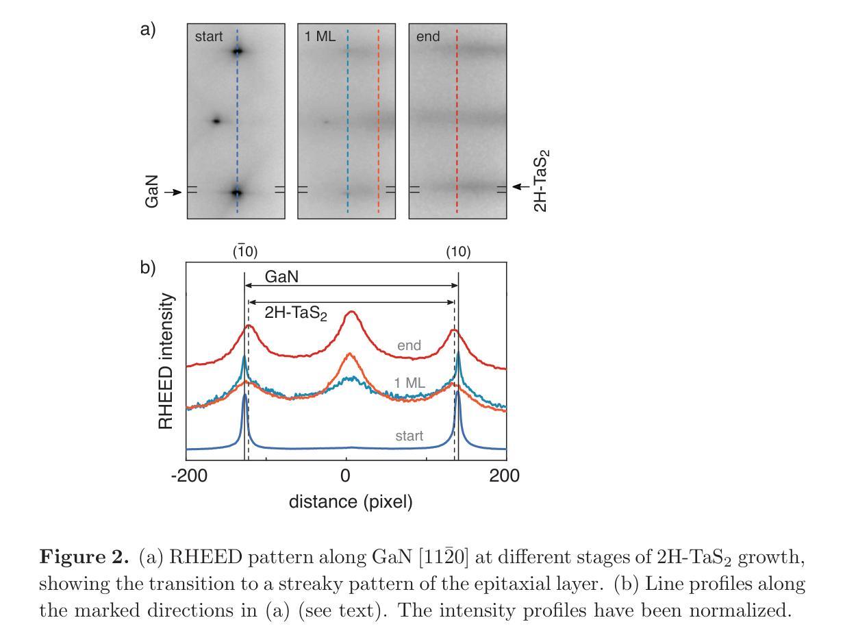 本文中,2H-TaS$_2$薄层已经外延生长在GaN(0001)上。衬底生长温度高达825$^{\circ}$C,通过原位电子衍射(反射式高能电子衍射和劳厄电子衍射)显示,这有利于获得最佳的外延层结构特性。二维覆盖层在单层沉积后无应变生长。然而,扫描透射电子显微镜证据表明界面处存在凹坑,这可能是由于在高温生长过程中GaN的热分解造成的。原位X射线光电子能谱显示核心能级发生偏移,这与从n-GaN(0001)到2H-TaS$_2$外延层的电子转移有关,同时在界面附近形成高浓度的氮空位。此外,从XPS结果推断,衬底与生长的TaS$_2$覆盖层之间界面没有发生化学反应,这证实了将二维的2H-TaS$_2$与重要的三维半导体材料如GaN集成的可能性。