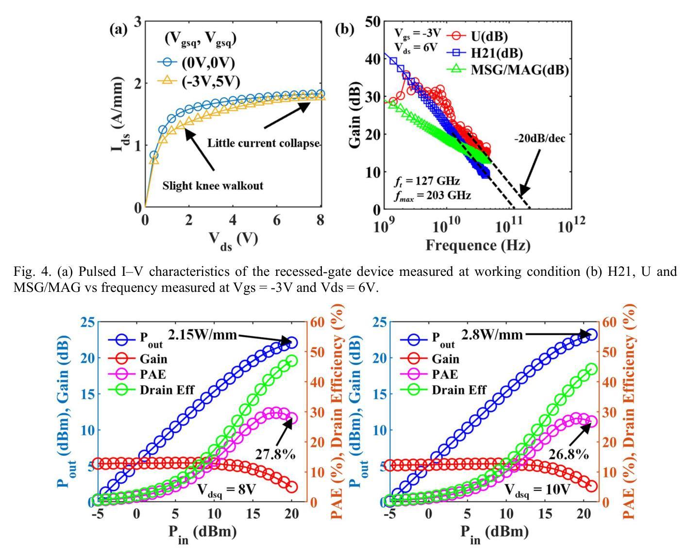 - 小信号表征显示器件具有高截止频率和最大振荡频率,分别为127 GHz和203 GHz。