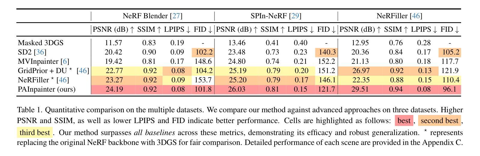 - 通过迭代细化插值并优化三维高斯表示,PAInpainter提高了恢复的三维场景的全局连贯性和纹理保真度。