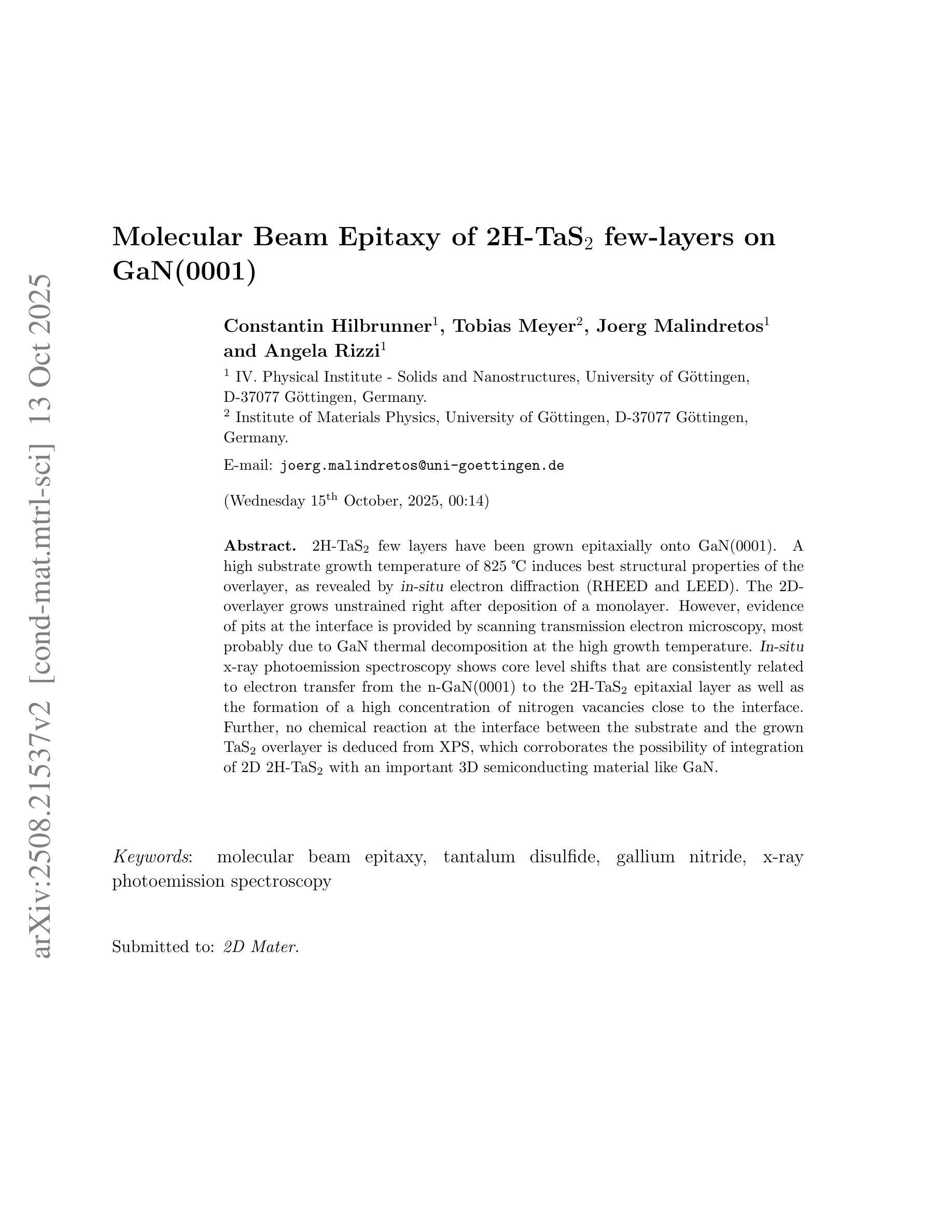 本文报道了在GaN(0001)上生长少量层数的2H-TaS2薄层的研究结果。研究发现,在高达825°C的基底生长温度下,可获得最佳结构特性的覆盖层。通过原位电子衍射(RHEED和LEED)技术观察发现,刚沉积一个单层后,二维覆盖层处于无应变状态。然而,扫描透射电子显微镜观察到界面处有坑,可能是由于在高温生长过程中GaN的热分解所致。原位X射线光电子能谱显示核心能级发生变化,这与其与n-GaN(0001)向2H-TaS2外延层的电子转移以及界面附近高浓度的氮空位形成有关。此外,XPS结果表明基底和生长的TaS2覆盖层之间未发生化学反应,这证实了将二维的2H-TaS2与重要的三维半导体材料如GaN集成的可能性。