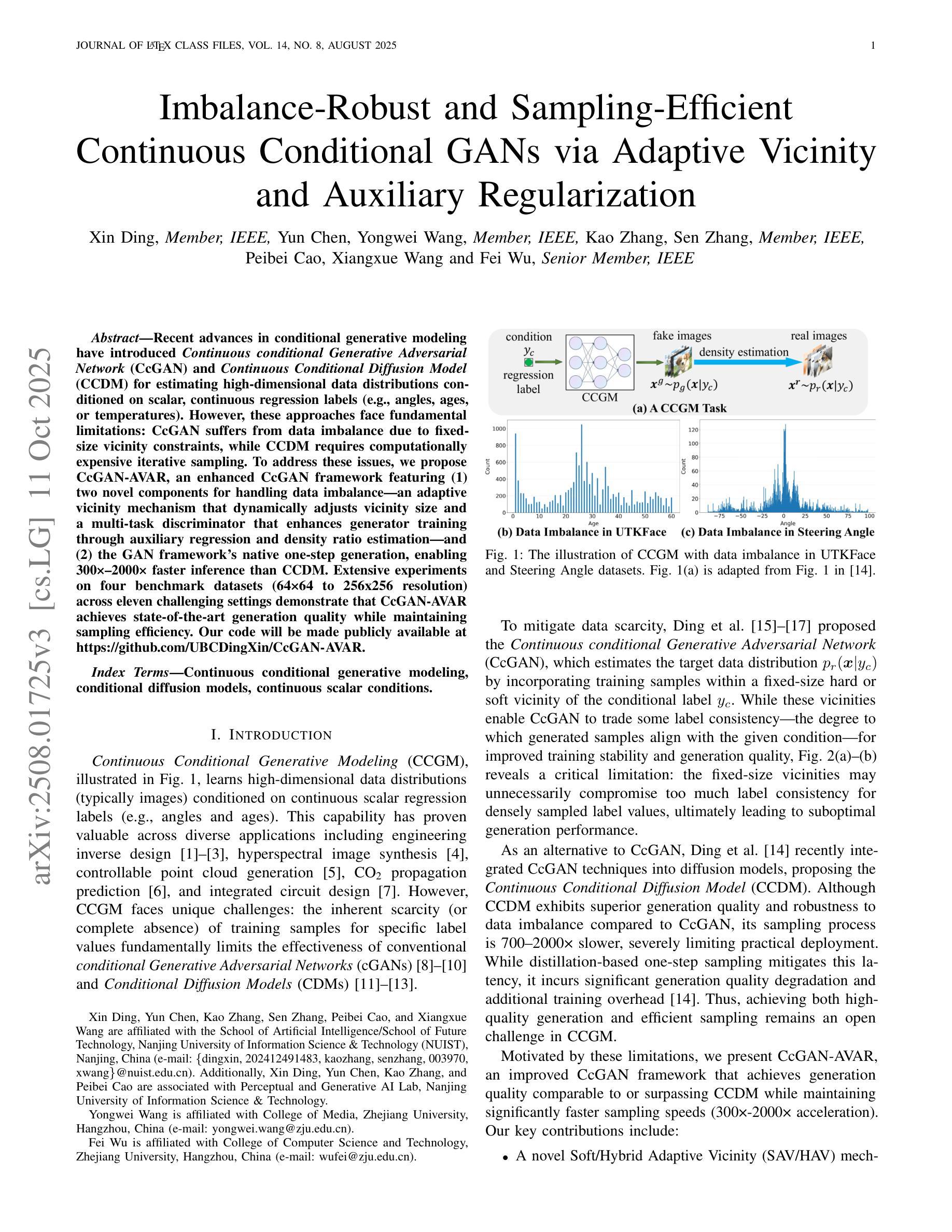 最新的条件生成模型进展已经引入了连续条件生成对抗网络(CcGAN)和连续条件扩散模型(CCDM),用于估计基于标量、连续回归标签的高维数据分布(例如角度、年龄或温度)。然而,这些方法面临基本局限:CcGAN由于固定大小的邻近约束而受到数据不平衡的影响,而CCDM需要计算昂贵的迭代采样。为了解决这些问题,我们提出了CcGAN-AVAR,这是一个增强的CcGAN框架,具有以下特点:(1)两个用于处理数据不平衡的新组件——自适应邻近机制,可动态调整邻近大小,多任务鉴别器,通过辅助回归和密度比率估计增强生成器训练;(2)GAN框架的本地一步生成器,使推理速度比CCDM快30倍至2000倍。在四个基准数据集(64x64至256x256分辨率)上进行的十一个具有挑战性的设置的大量实验表明,CcGAN-AVAR在保持采样效率的同时实现了最先进的生成质量。