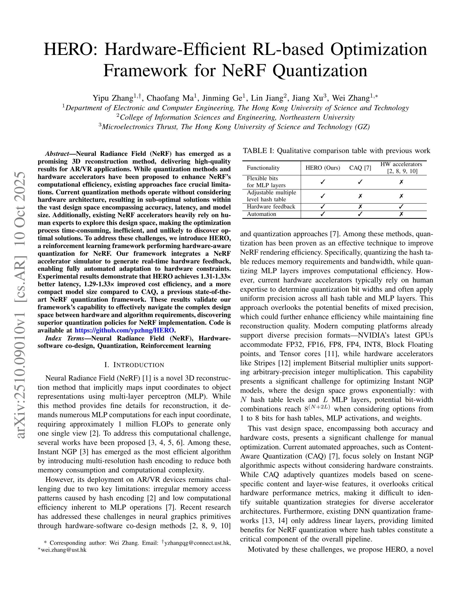 Neural Radiance Field (NeRF) has emerged as a promising 3D reconstruction method, delivering high-quality results for AR/VR applications. While quantization methods and hardware accelerators have been proposed to enhance NeRF’s computational efficiency, existing approaches face crucial limitations. Current quantization methods operate without considering hardware architecture, resulting in sub-optimal solutions within the vast design space encompassing accuracy, latency, and model size. Additionally, existing NeRF accelerators heavily rely on human experts to explore this design space, making the optimization process time-consuming, inefficient, and unlikely to discover optimal solutions. To address these challenges, we introduce HERO, a reinforcement learning framework performing hardware-aware quantization for NeRF. Our framework integrates a NeRF accelerator simulator to generate real-time hardware feedback, enabling fully automated adaptation to hardware constraints. Experimental results demonstrate that HERO achieves 1.31-1.33 $\times$ better latency, 1.29-1.33 $\times$ improved cost efficiency, and a more compact model size compared to CAQ, a previous state-of-the-art NeRF quantization framework. These results validate our framework’s capability to effectively navigate the complex design space between hardware and algorithm requirements, discovering superior quantization policies for NeRF implementation. Code is available at https://github.com/ypzhng/HERO.