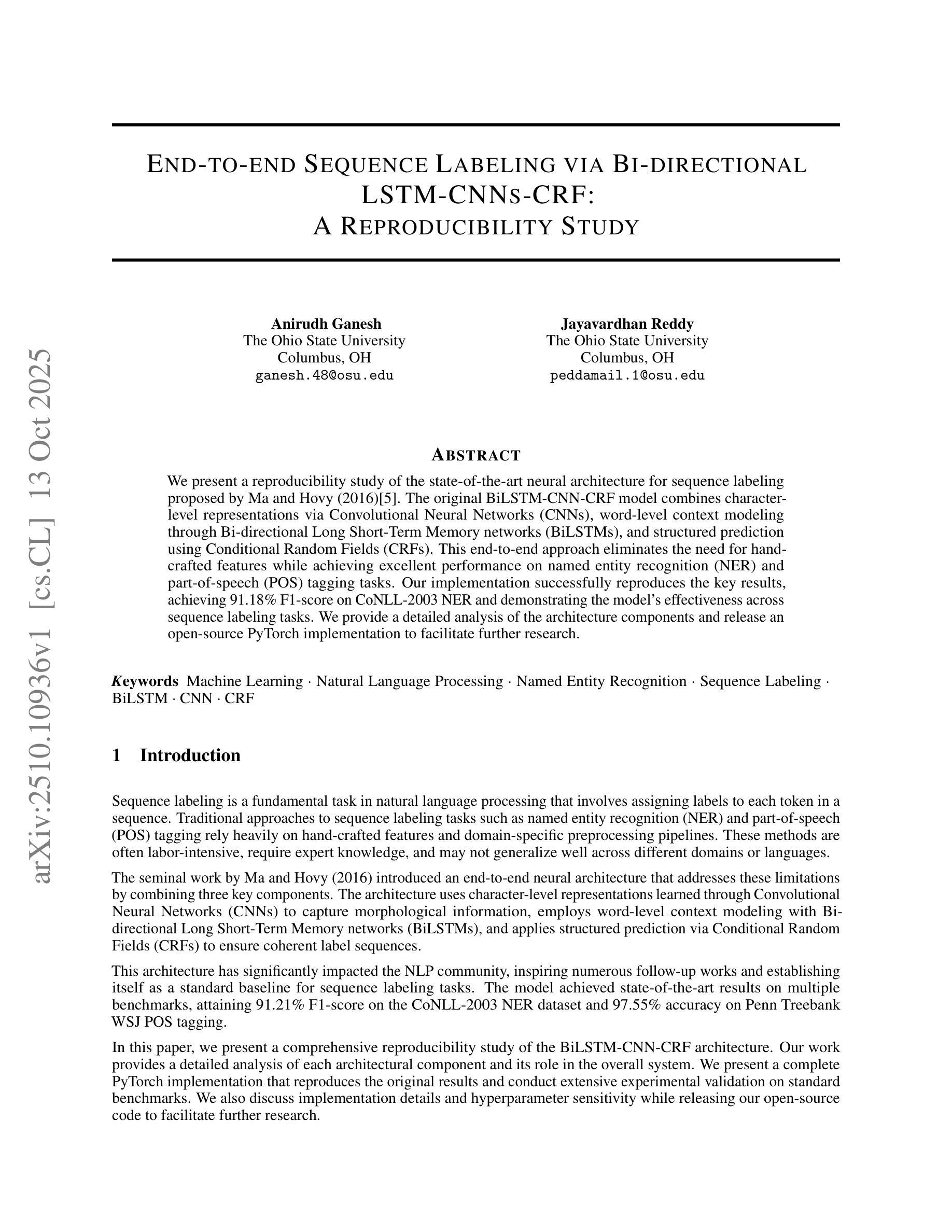 针对Ma和Hovy(2016)提出的最新神经网络架构进行可重复性研究。原BiLSTM-CNN-CRF模型通过卷积神经网络(CNN)进行字符级表示,通过双向长短时记忆网络(BiLSTM)进行单词级上下文建模,并使用条件随机字段(CRF)进行结构化预测。这种端到端的方法无需手工特征,在命名实体识别(NER)和词性标注(POS)任务上表现优异。我们的实现成功复现了关键结果,在CoNLL-2003 NER任务上实现了91.18%的F1分数,证明了该模型在序列标注任务中的有效性。我们提供了对该架构组件的详细分析,并发布了开源PyTorch实现,以促进进一步的研究。