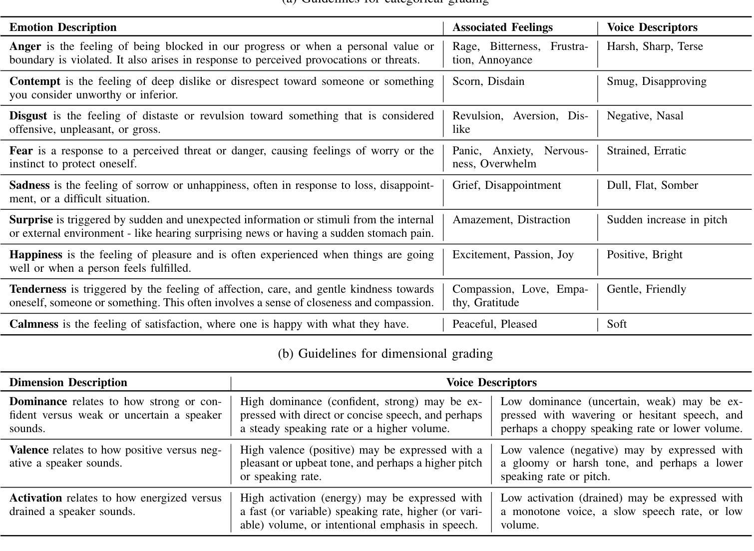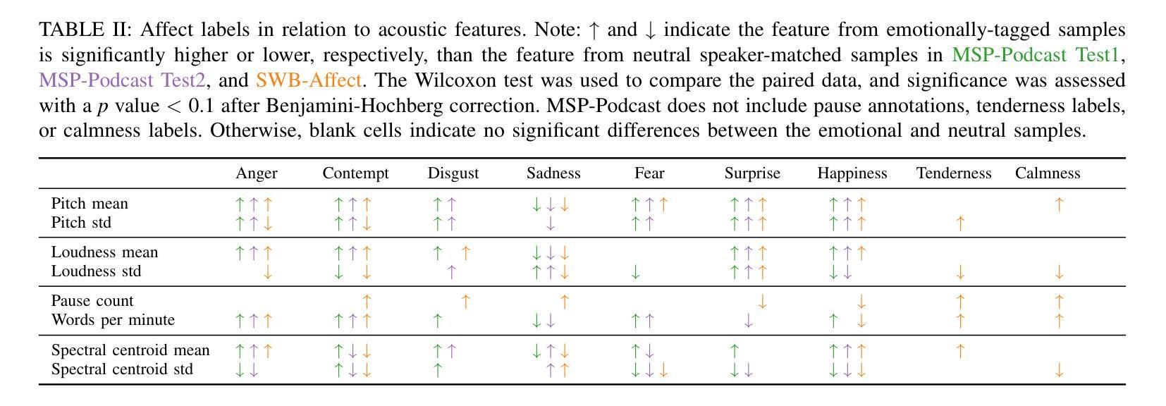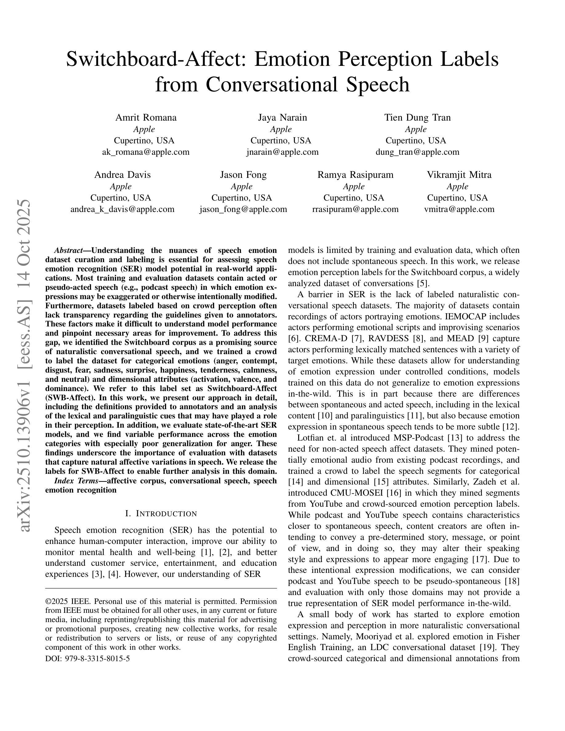 理解和把握语音情感数据集整理和标注的细微差别,对于评估语音情感识别(SER)模型在真实世界应用中的潜力至关重要。大多数训练和评估数据集包含的行为或模拟行为的语音(例如,播客语音)中的情感表达可能过于夸张或故意修改。此外,基于群体感知标注的数据集往往缺乏对标注者所给指南的透明度。这些因素使得理解模型性能并指出必要的改进领域变得困难。为了弥补这一差距,我们确定了Switchboard语料库是自然会话语音的有前途的来源,我们培训了一个群体来标注数据集中的分类情感(愤怒、蔑视、厌恶、恐惧、悲伤、惊讶、快乐、温柔、冷静和中性)和维度属性(激活、效价和支配性)。我们将这个标签集称为Switchboard-Affect(SWB-Affect)。在这项工作中,我们详细介绍了我们的方法,包括为标注者提供的定义,以及分析可能在其感知中起作用的词汇和副语言线索。此外,我们评估了最先进的SER模型,发现情绪类别之间的性能各不相同,其中对愤怒的泛化尤其差。这些发现强调了使用捕捉自然情感变化的语音数据集进行评估的重要性。我们发布SWB-Affect的标签,以推动该领域的进一步分析。