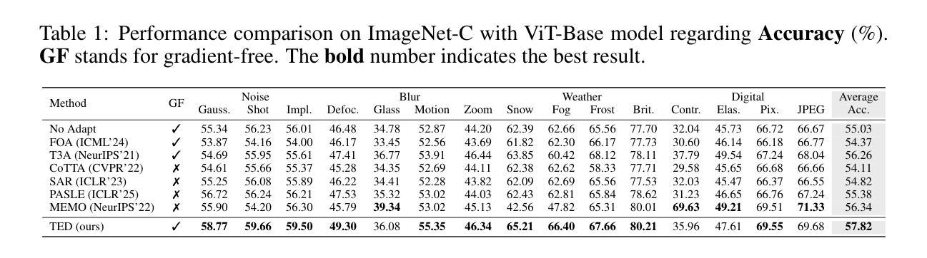 - TED不使用反向传播,冻结模型参数,实现高效、无遗忘的适应,具有最小的内存和计算开销。