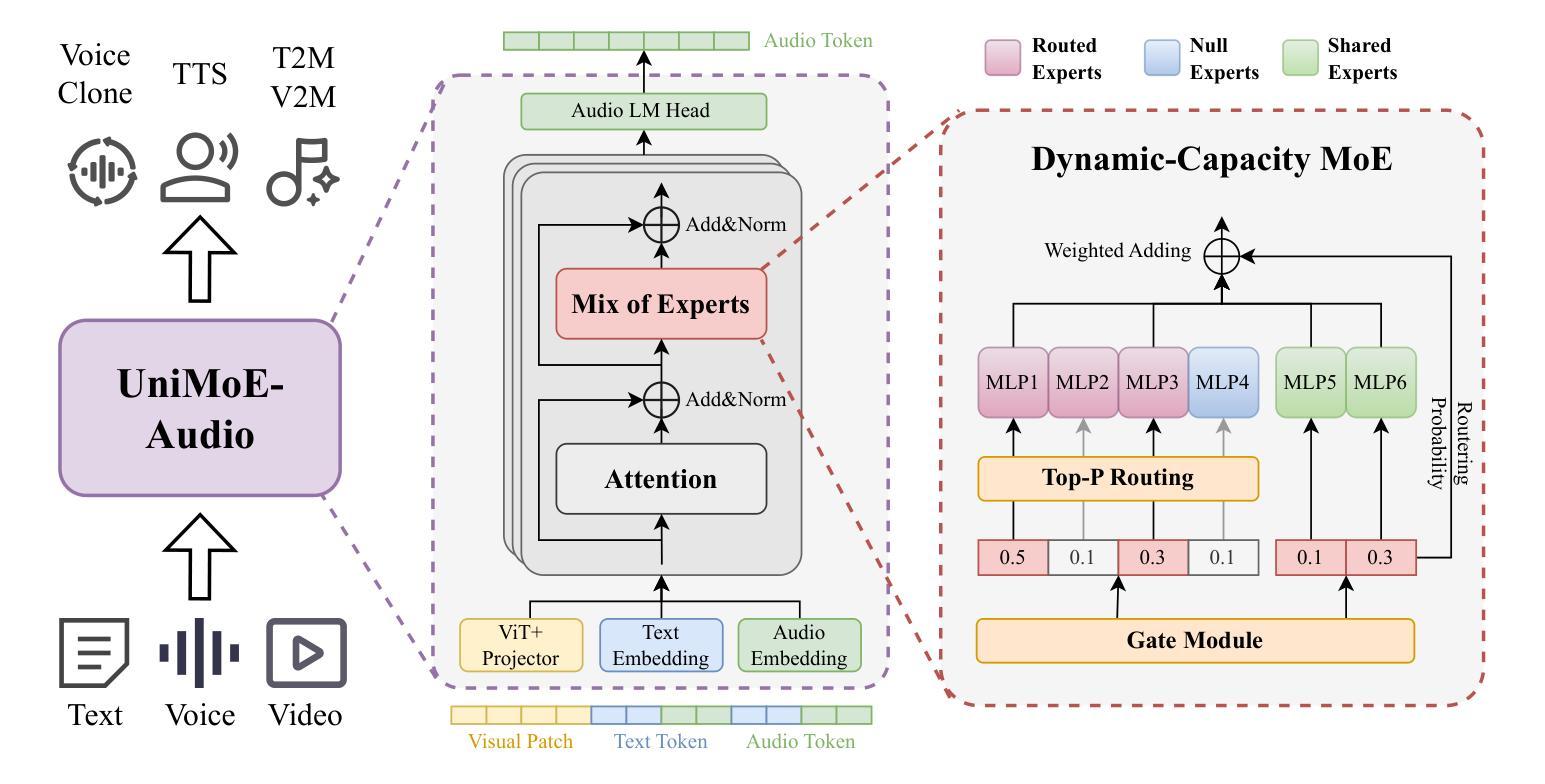 - UniMoE-Audio采用顶级P路由策略和混合专家架构设计。