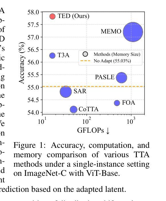 - 提出的TED方法是一种新型单实例TTA方法,采用前向坐标优化,更新低维向量以提高输出信心和潜在表示。