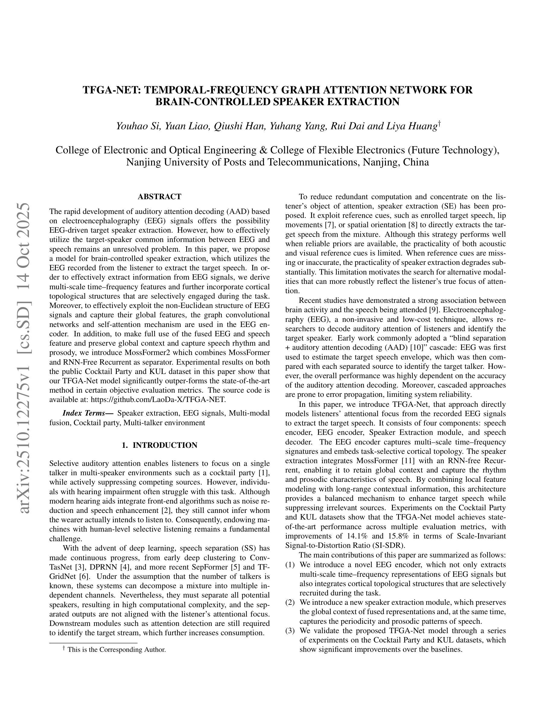 基于脑电图信号的听觉注意力解码(AAD)快速发展,为EEG驱动的目标语音提取提供了可能。本文提出一种脑控语音提取模型,利用听众的脑电图进行目标语音提取。通过提取EEG信号的多尺度时间-频率特征并融入皮质拓扑结构,结合图卷积网络和自注意力机制的EEG编码器,有效挖掘EEG信号的非欧几里得结构并捕捉全局特征。同时,通过MossFormer2分离器结合MossFormer和RNN-Free Recurrent技术,充分利用融合后的EEG和语音特征,保留全局语境并捕捉语音节奏和语调。在公共鸡尾酒会和KUL数据集上的实验结果表明,本文的TFGA-Net模型在某些客观评价指标上显著优于现有方法。