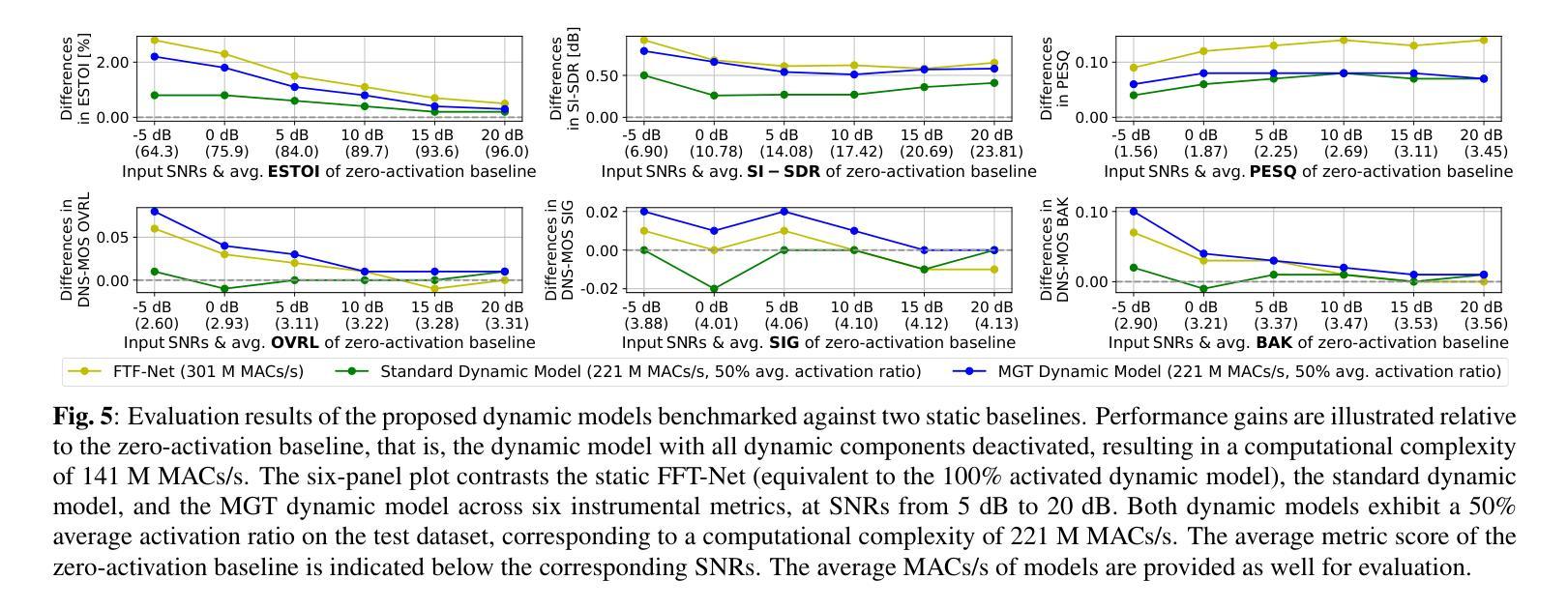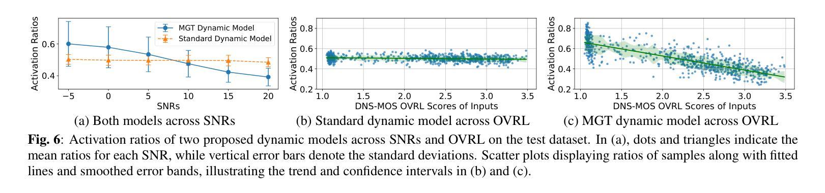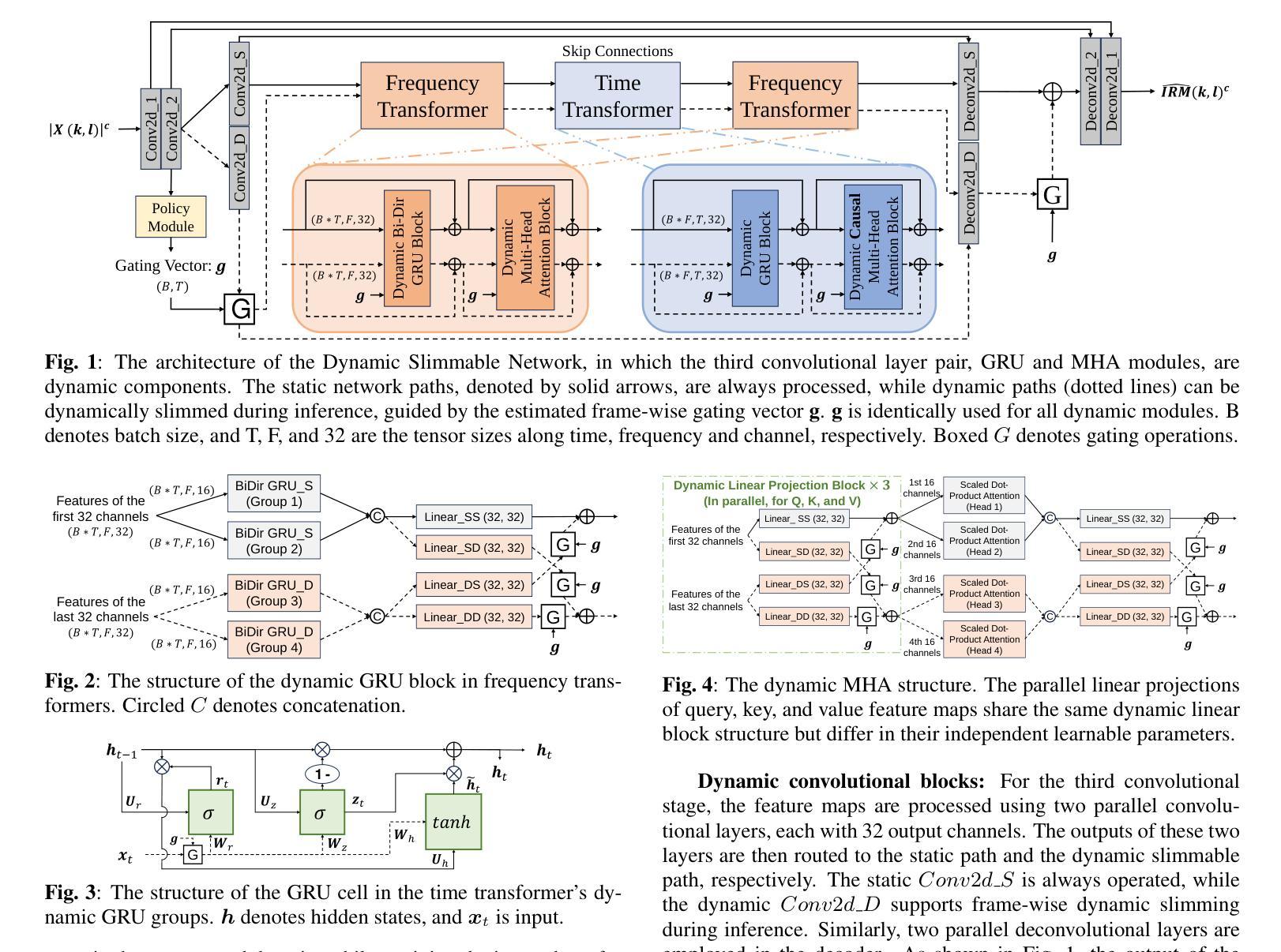 为了进一步简化轻量级语音增强模型的复杂性,我们引入了一种基于门控的动态可缩放网络(DSN)。DSN包含静态和动态组件。为了实现独立于架构的适用性,我们针对常用组件引入了不同的动态结构,即分组循环神经网络单元、多头注意力、卷积和全连接层。策略模块根据输入信号质量以帧级分辨率自适应地控制动态部分的使用,控制计算负载。我们还提出了Metric-Guided Training(MGT)来明确指导策略模块评估输入语音质量。实验结果表明,DSN在仪器指标上达到了与最新轻量级基线相当的增强性能,而平均计算负载仅为其73%。对动态组件使用率的评估表明,MGT-DSN可以根据输入信号失真的严重程度适当地分配网络资源。