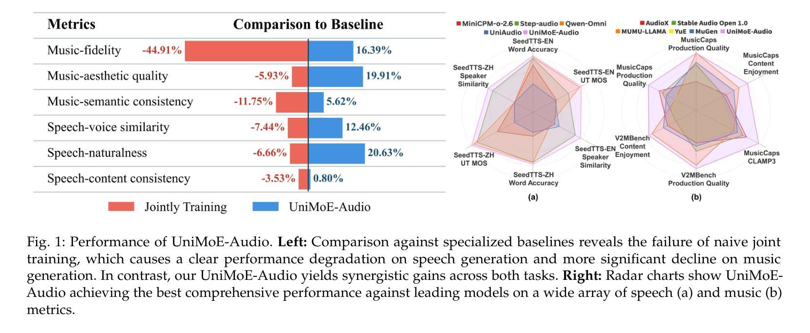 - UniMoE-Audio模型在动态容量MoE框架下实现了语音和音乐的统一生成。