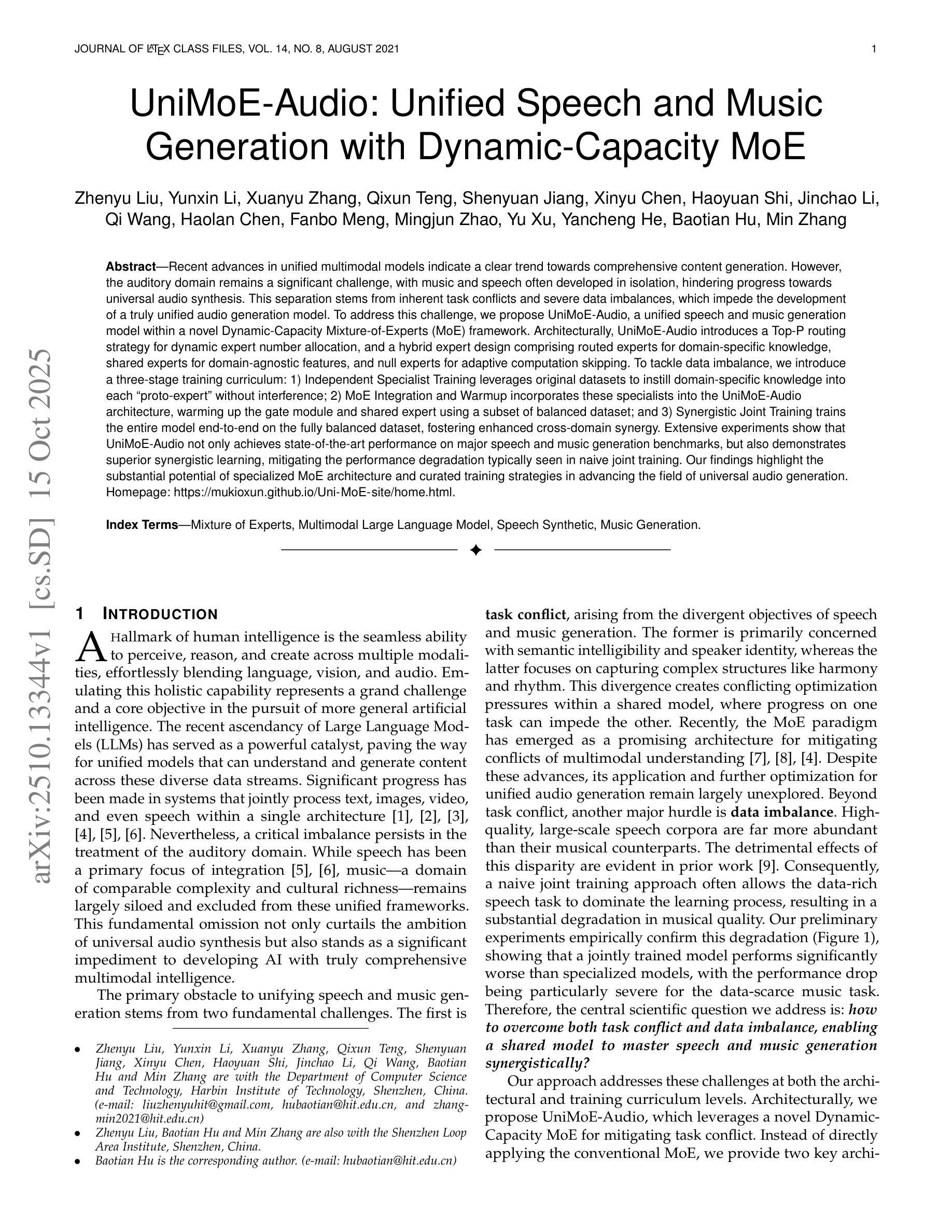 Recent advances in unified multimodal models indicate a clear trend towards comprehensive content generation. However, the auditory domain remains a significant challenge, with music and speech often developed in isolation, hindering progress towards universal audio synthesis. This separation stems from inherent task conflicts and severe data imbalances, which impede the development of a truly unified audio generation model. To address this challenge, we propose UniMoE-Audio, a unified speech and music generation model within a novel Dynamic-Capacity Mixture-of-Experts (MoE) framework. Architecturally, UniMoE-Audio introduces a Top-P routing strategy for dynamic expert number allocation, and a hybrid expert design comprising routed experts for domain-specific knowledge, shared experts for domain-agnostic features, and null experts for adaptive computation skipping. To tackle data imbalance, we introduce a three-stage training curriculum: 1) Independent Specialist Training leverages original datasets to instill domain-specific knowledge into each “proto-expert” without interference; 2) MoE Integration and Warmup incorporates these specialists into the UniMoE-Audio architecture, warming up the gate module and shared expert using a subset of balanced dataset; and 3) Synergistic Joint Training trains the entire model end-to-end on the fully balanced dataset, fostering enhanced cross-domain synergy. Extensive experiments show that UniMoE-Audio not only achieves state-of-the-art performance on major speech and music generation benchmarks, but also demonstrates superior synergistic learning, mitigating the performance degradation typically seen in naive joint training. Our findings highlight the substantial potential of specialized MoE architecture and curated training strategies in advancing the field of universal audio generation. Homepage: https://mukioxun.github.io/Uni-MoE-site/home.html
