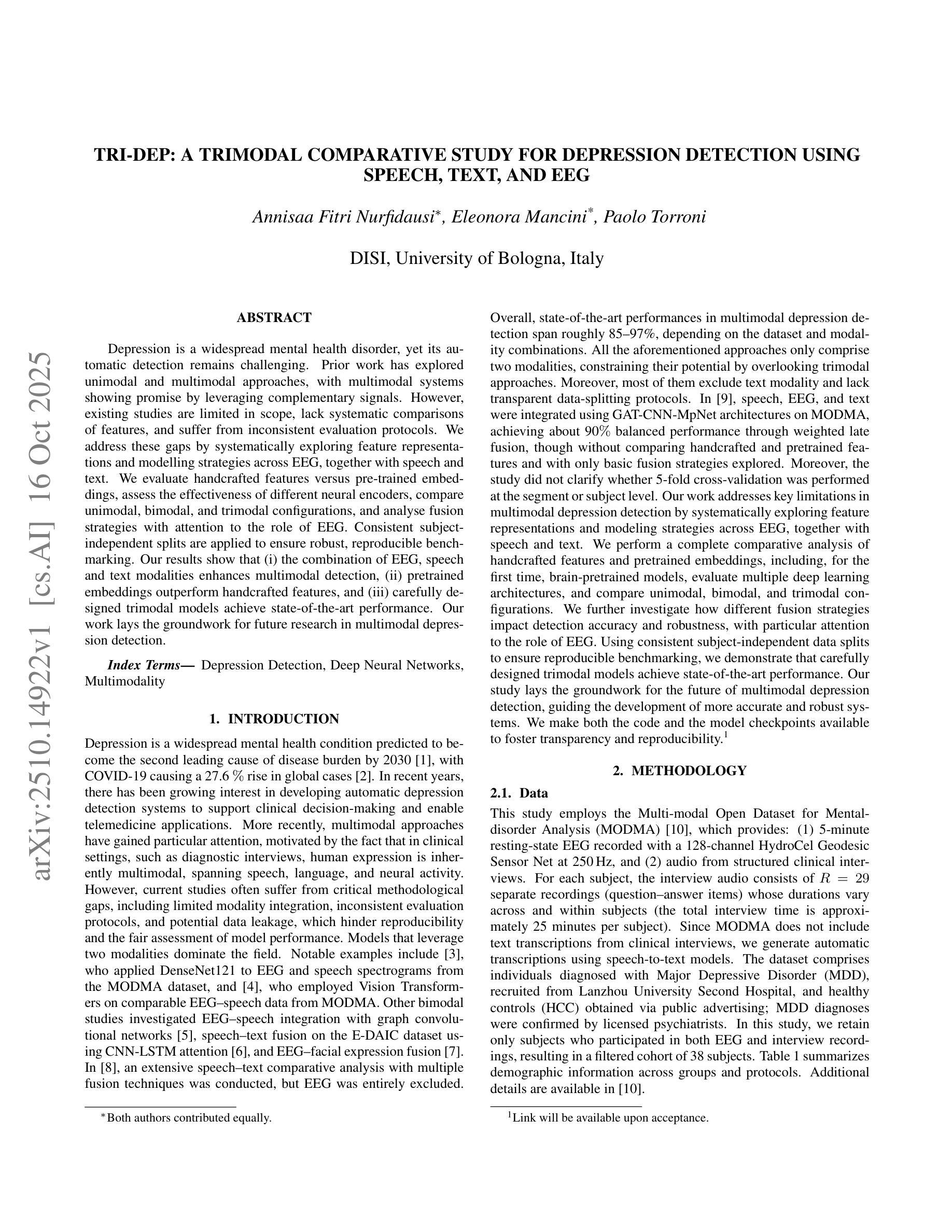 关于抑郁症的自动检测是一项重要的挑战,虽然已经有许多关于单模态和多模态方法的研究,但现有的研究仍存在局限性,缺乏系统的特征比较和一致的评价协议。本研究系统地探讨了EEG、语音和文本的特征表示和建模策略,评估了手工特征和预训练嵌入的效果,比较了单模态、双模态和三模态配置,并分析了融合策略中EEG的作用。研究采用一致的受试者独立分割方法,以确保稳健、可重复性的评估。结果表明,多模态检测中结合EEG、语音和文本模态的效果更佳,预训练嵌入优于手工特征,精心设计的三模态模型达到最佳性能。本研究为未来的多模态抑郁症检测研究奠定了基础。