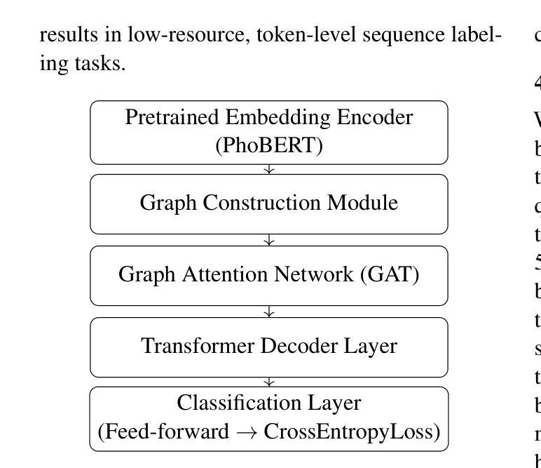 提出一种名为TextGraphFuseGAT的新型神经网络架构,结合了预训练的PhoBERT编码器和图注意力网络,用于令牌级分类任务。该模型构建了一个完全连接的图,基于PhoBERT产生的令牌嵌入,使GAT层能够捕获丰富的令牌间依赖关系,而不仅仅是基于顺序上下文建模。通过图增强嵌入之上应用Transformer风格的自注意力层,进一步增强了上下文。最终的令牌表示通过分类头进行传递,以执行序列标注。在越南语基准数据集上进行评估,包括PhoNER-COVID19、PhoDisfluency和VietMed-NER。实验结果证实,该方法优于包括仅使用变换器和混合神经网络模型在内的强基线,证明了将预训练语义特征与图关系建模相结合的有效性,可改善跨多个领域的令牌分类。