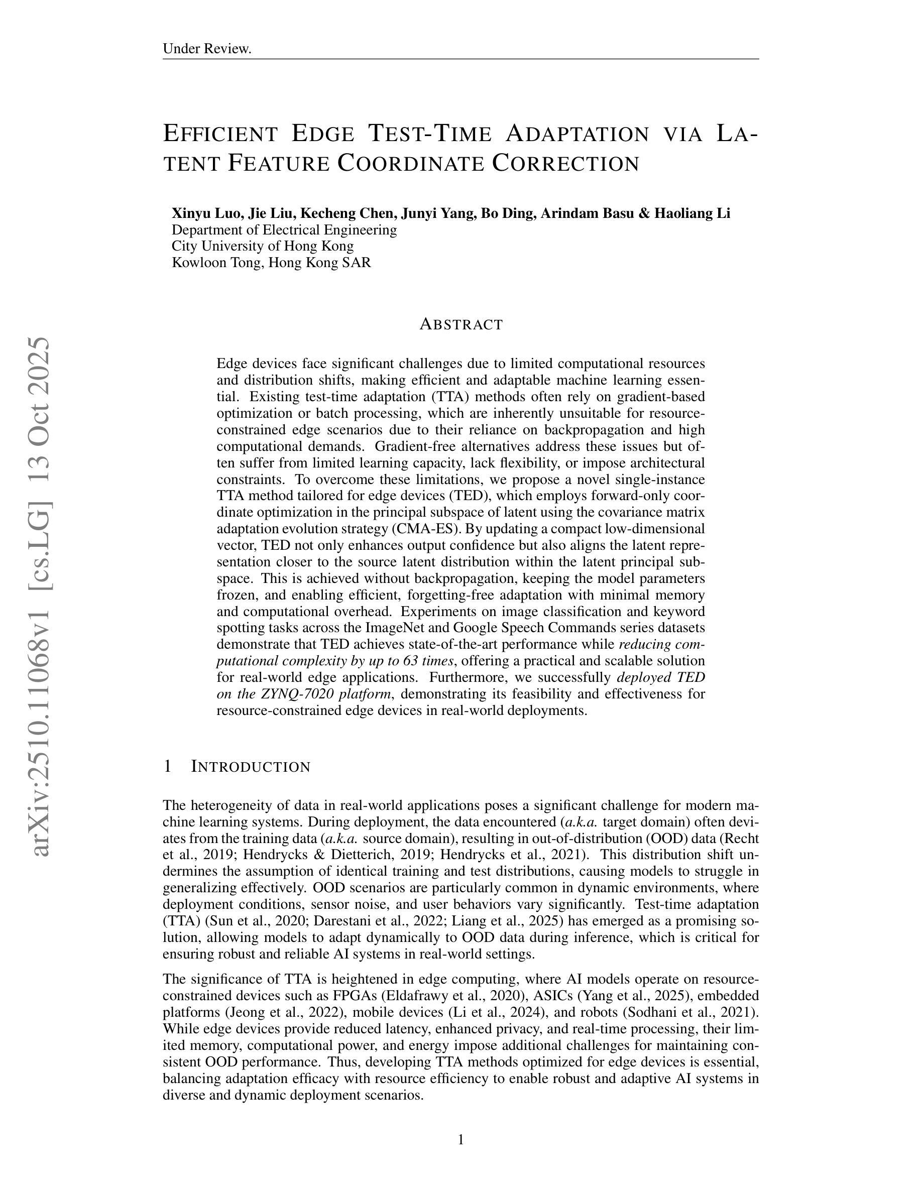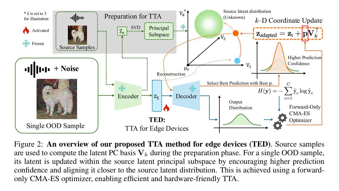边缘设备由于计算资源有限和分布转移而面临重大挑战,这使得高效和可适应的机器学习方法变得至关重要。现有的测试时间自适应(TTA)方法通常依赖于基于梯度的优化或批量处理,由于其依赖反向传播和计算需求较高,因此在资源受限的边缘场景中并不适合。无梯度替代方案解决了这些问题,但往往存在学习容量有限、缺乏灵活性或施加架构约束等缺点。为了克服这些局限性,我们提出了一种针对边缘设备的新型单实例TTA方法(TED),它采用仅前向传播的坐标优化,在潜在的主子空间中使用协方差矩阵适应进化策略(CMA-ES)。通过更新紧凑的低维向量,TED不仅提高了输出信心,而且使潜在表示更接近源潜在分布在潜在的主子空间内。这是在不进行反向传播的情况下实现的,保持模型参数冻结,并实现了高效、无遗忘的适应,具有极低的内存和计算开销。在ImageNet和Google语音命令系列数据集上进行图像分类和关键词识别任务的实验表明,TED在减少高达63倍的计算复杂性的同时实现了最先进的性能表现,为现实世界的边缘应用提供了实用且可扩展的解决方案。此外,我们在ZYNQ-7020平台上成功部署了TED,证明了其在资源受限的边缘设备的实际部署中的可行性和有效性。