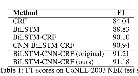 - 研究成功复现了关键结果,并在CoNLL-2003 NER任务上达到了91.18%的F1分数。