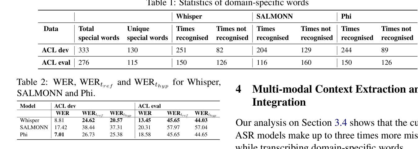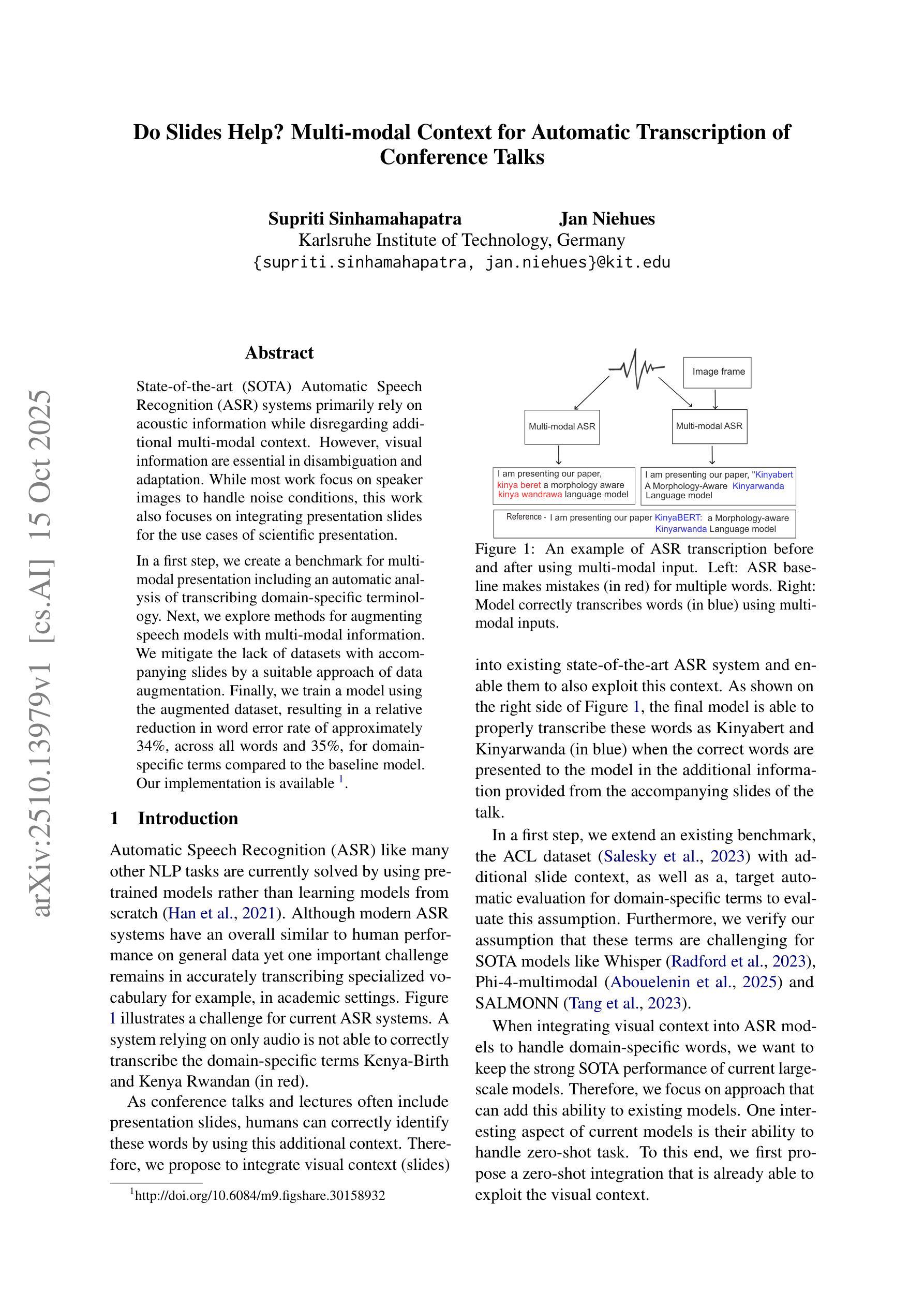 当前最先进的自动语音识别(ASR)系统主要依赖于声学信息,而忽略了额外的多模态上下文。然而,视觉信息在澄清和适应方面非常重要。虽然大多数工作都专注于使用发言人图像来处理噪声条件,但这项工作还专注于整合演示幻灯片以用于科学演示。首先,我们为包括特定领域术语的自动转录的多模态演示创建了一个基准测试。接下来,我们探索了用多模态信息增强语音模型的方法。我们通过适当的数据增强方法缓解了缺乏附带幻灯片的数据集的问题。最后,我们使用增强数据集训练了一个模型,与基准模型相比,该模型在所有单词上的词错误率大约降低了3 4%,在特定领域的术语上降低了3 5%。