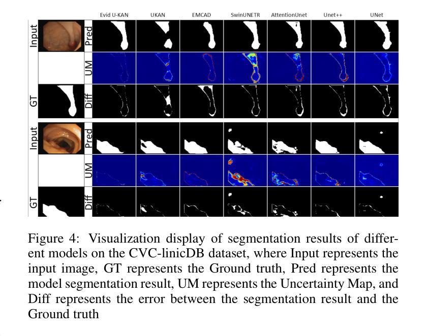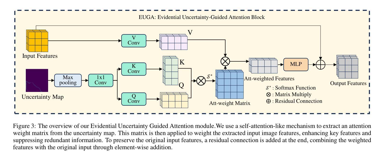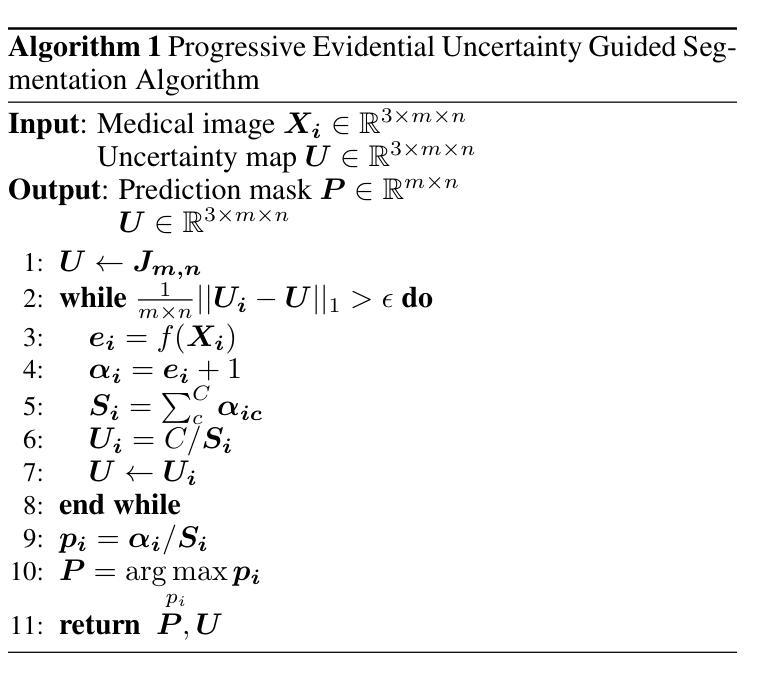 可信医学图像分割旨在提供准确可靠的结果,为临床决策提供支持。大多数现有方法采用证据深度学习(EDL)范式,因其计算效率和理论稳健性。然而,基于EDL的方法往往忽略了利用富含注意力线索的不确定性映射来细化模糊的边界分割。为了解决这一问题,我们提出了一种渐进证据不确定性引导注意力(PEUA)机制,引导模型关注困难区域特征表示学习。与常规方法不同,PEUA利用不确定性映射逐步细化注意力,同时采用低秩学习对注意力权重进行去噪,增强对挑战区域的特征学习。同时,标准EDL方法通过Kullback-Leibler(KL)正则化无差别地抑制错误类别的证据,损害模糊区域的不确定性评估,并因此扭曲相应的注意力引导。因此,我们引入了一种语义保留证据学习(SAEL)策略,集成语义平滑证据生成器和保真度增强正则化项以保留关键语义。最后,通过将PEUA和SAEL嵌入到最先进的U-KAN中,我们提出了Evidential U-KAN,这是一种可信医学图像分割的新解决方案。在四个数据集上的大量实验表明,其在准确性和可靠性方面优于其他方法。代码可在https://anonymous.4open.science/r/Evidence-U-KAN-BBE8的github上获取。