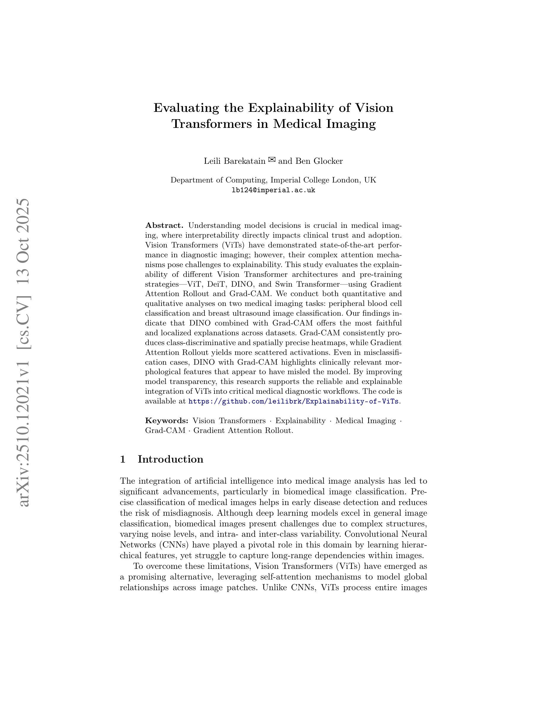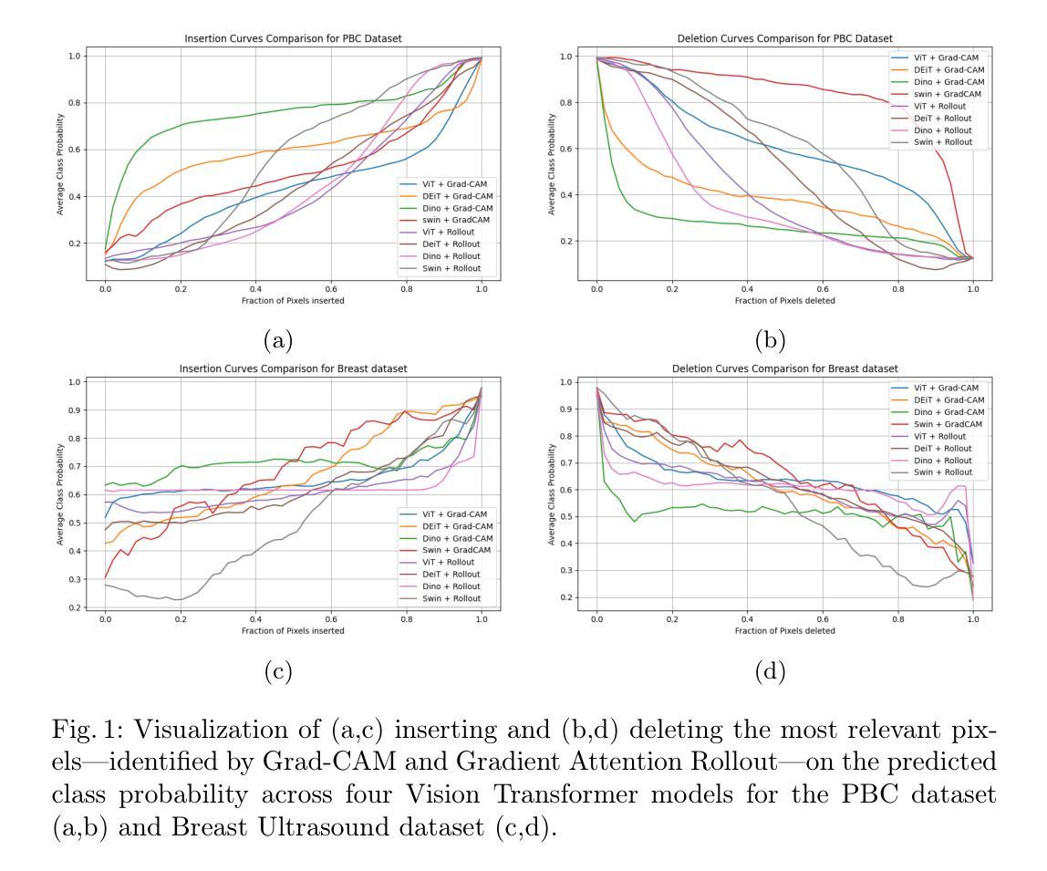 在医学成像领域,理解模型决策至关重要,因为可解释性直接影响临床信任和采用。视觉转换器(ViTs)在诊断成像方面表现出了卓越的性能;然而,其复杂的注意力机制对解释性构成挑战。本研究使用梯度注意力展开和Grad-CAM评估了不同的视觉转换器架构和预训练策略——ViT、DeiT、DINO和Swin Transformer的解释性。我们在两项医学成像任务上进行了定量和定性分析:外周血细胞分类和乳腺超声图像分类。我们的研究结果表明,DINO与Grad-CAM相结合提供了跨数据集最忠实和局部化的解释。Grad-CAM始终产生类别区分度高且空间精确的热图,而梯度注意力展开产生的激活更分散。即使在误分类的情况下,DINO与Grad-CAM也能突出临床上与形态相关的特征,这些特征似乎导致了模型的误导。通过提高模型的透明度,该研究支持将ViTs可靠且可解释地集成到关键的医学诊断工作流程中。