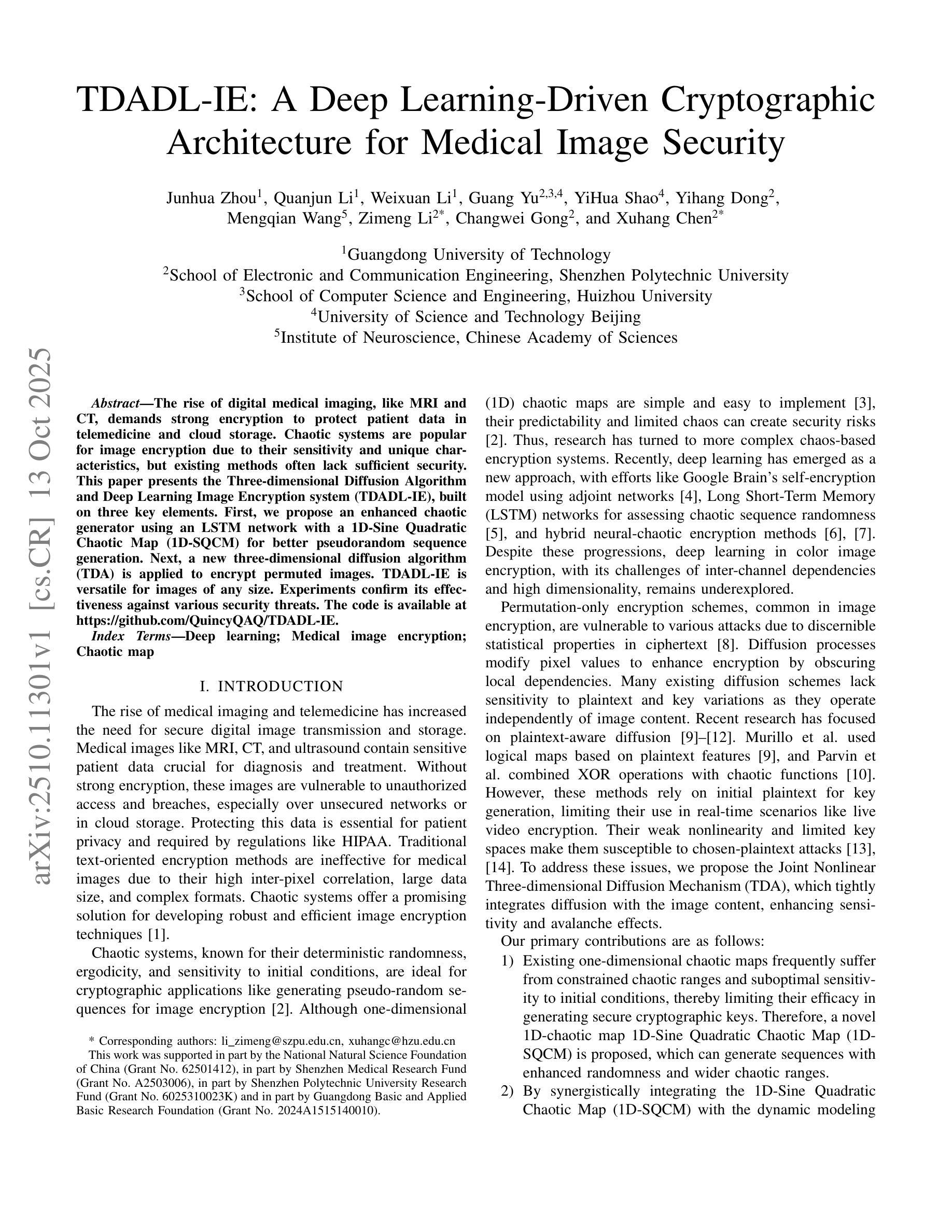 数字医学影像技术如MRI和CT的发展,要求远程医疗和云存储中的患者数据必须有强大的加密保护。本文提出基于三个关键元素的全新三维扩散算法与深度学习图像加密系统(TDADL-IE)。首先,利用LSTM网络与一维正弦二次混沌映射(1D-SQCM)构建增强型混沌生成器,以生成更佳的伪随机序列。其次,应用新型三维扩散算法(TDA)对置换图像进行加密。TDADL-IE适用于任何大小的图像,实验证实其能有效抵御各种安全威胁。代码公开于:https://github.com/QuincyQAQ/TDADL-IE。